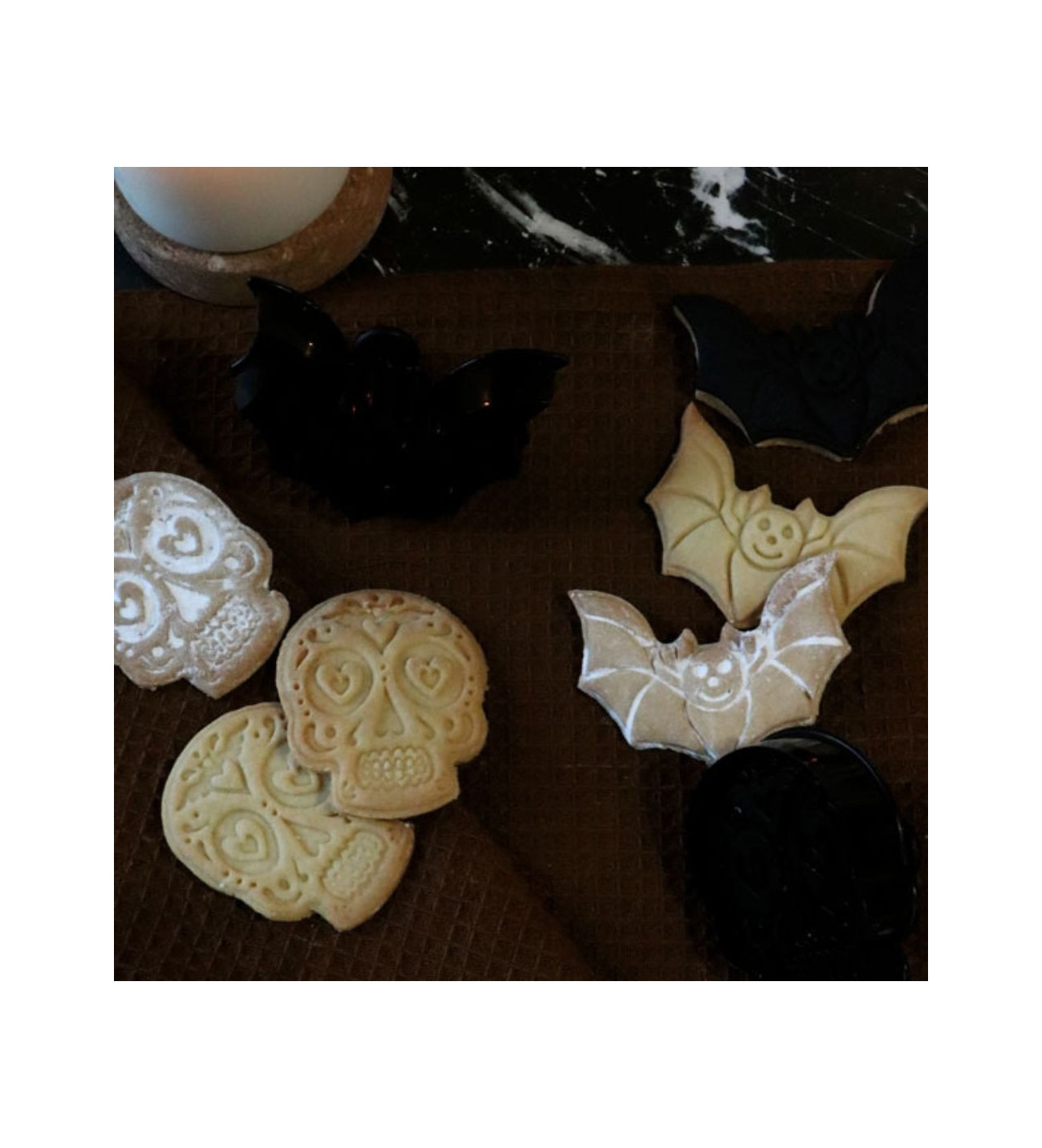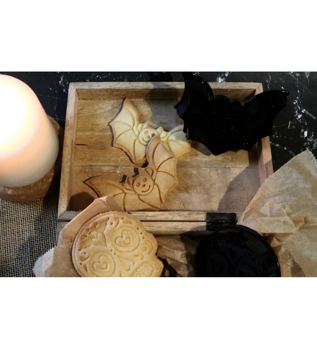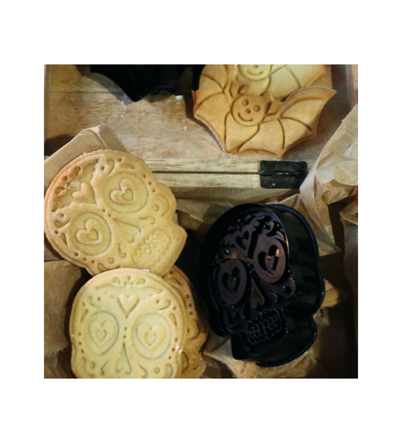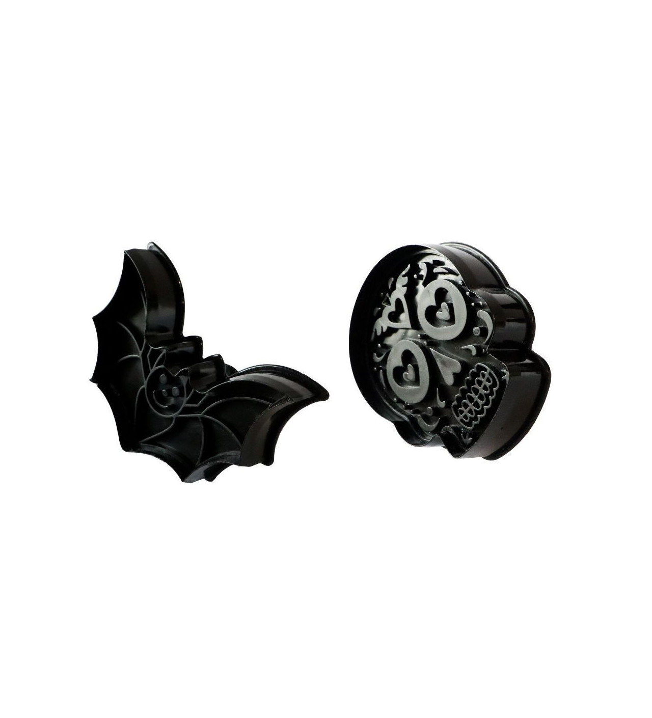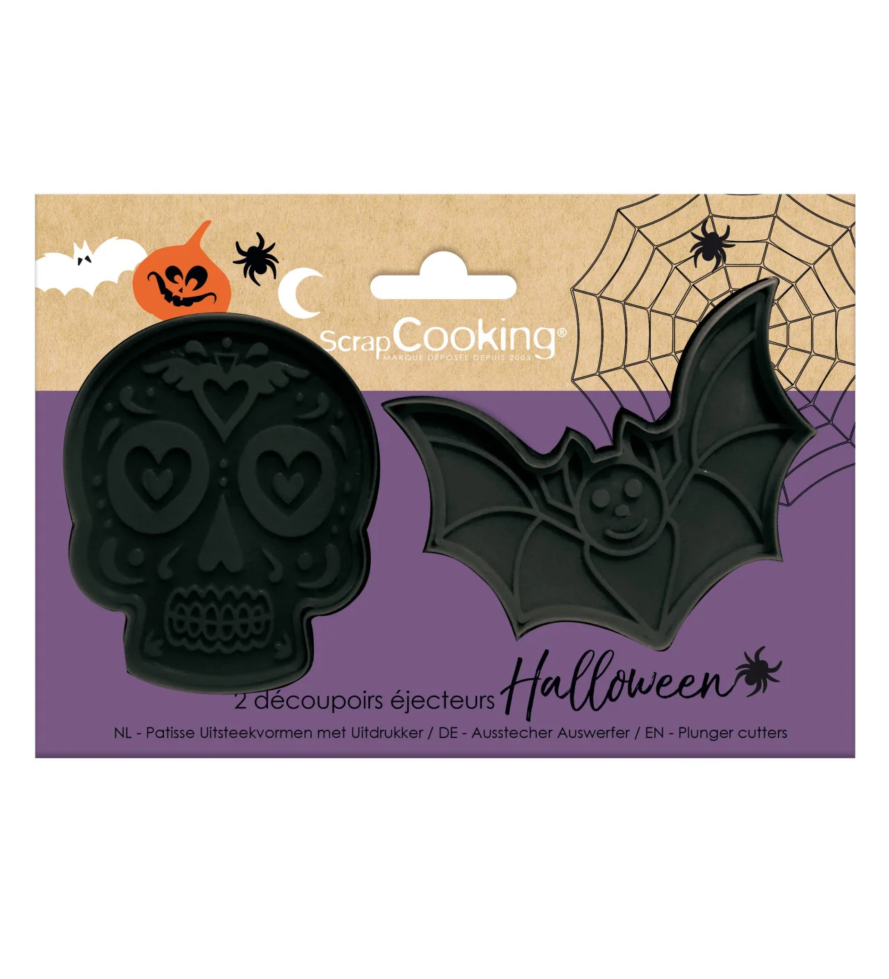 Pendant la préparation de votre repas d’Halloween, facilitez-vous la vie et confectionnez des biscuits en accord avec votre thème sans effort. Donnant la forme d’une chauve-souris et d’un crâne décoré à vos biscuits, les emporte-pièces Scrapcooking vous assure une fête d’Halloween emplie de frissons gourmands.