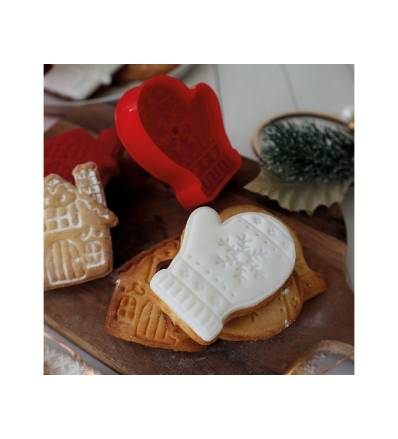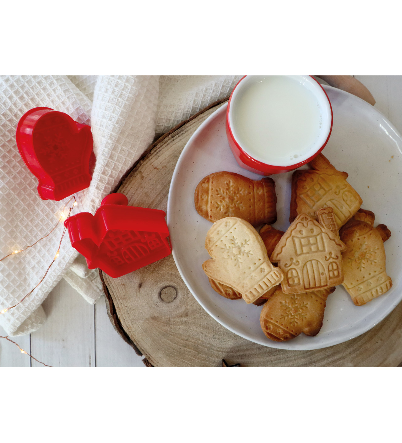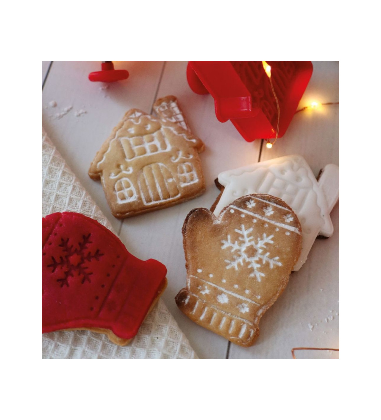 Ces deux découpoirs imprimeront dans votre pâte à biscuit de délicats motifs afin de former en un rien de temps des dessins de moufles et de maisons en pain d’épice. Petits et grands, et même le Père Noël se régaleront de ces créations charmantes.
