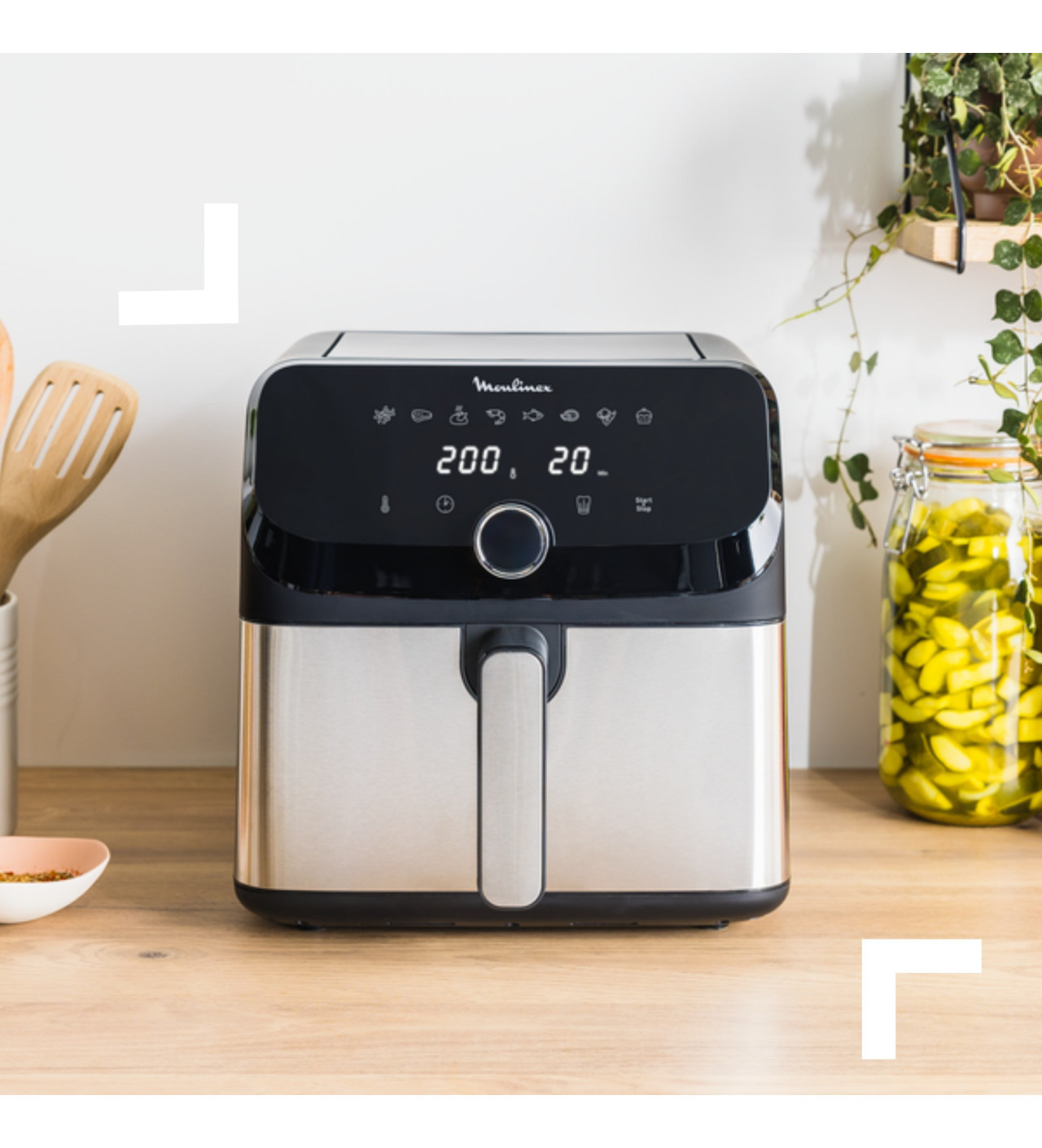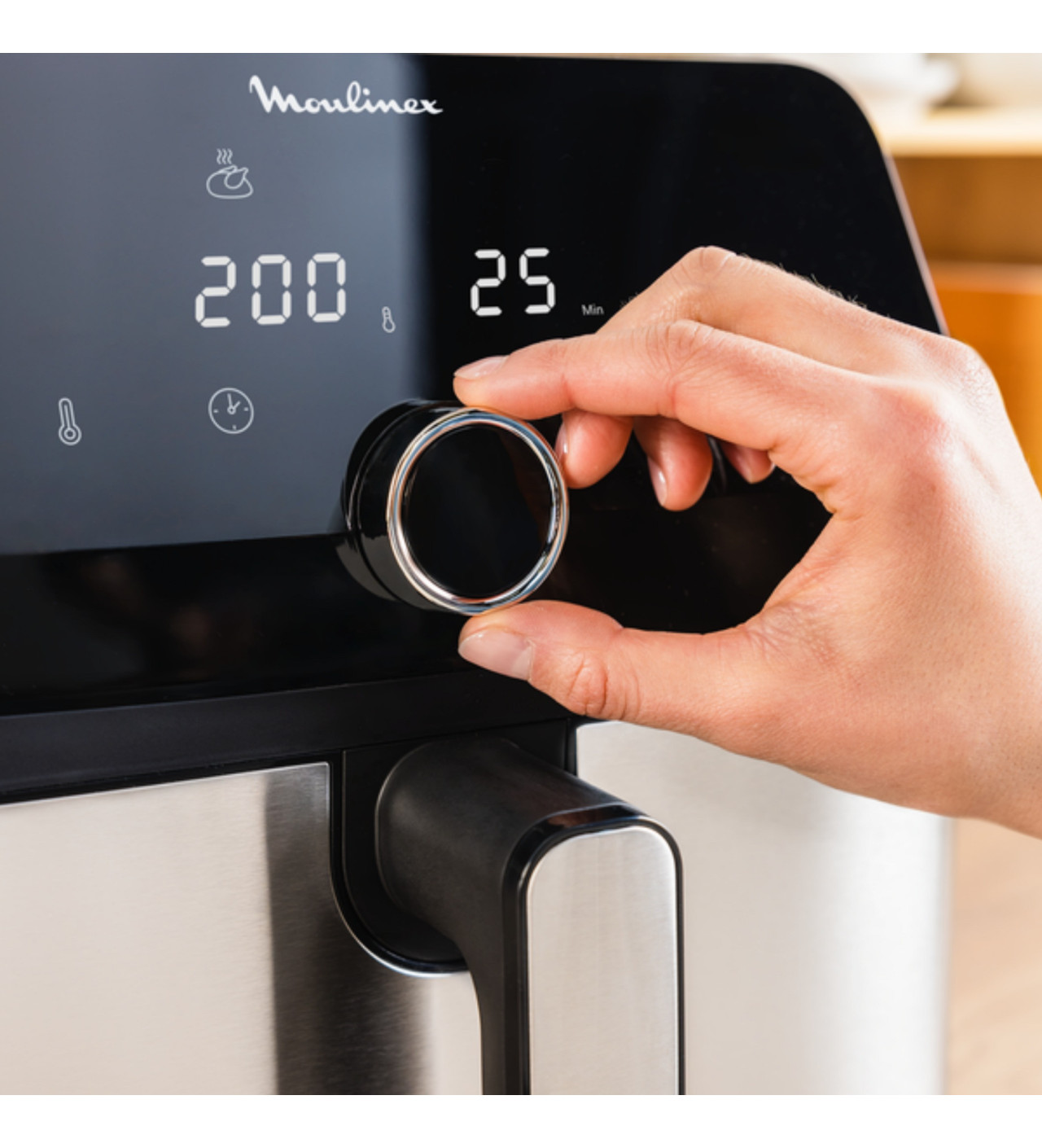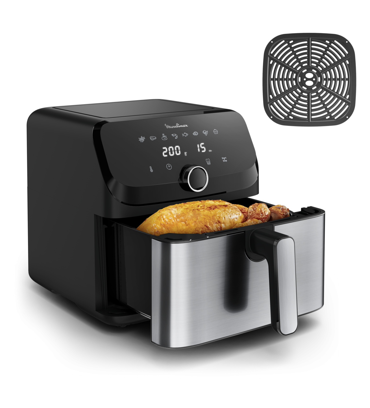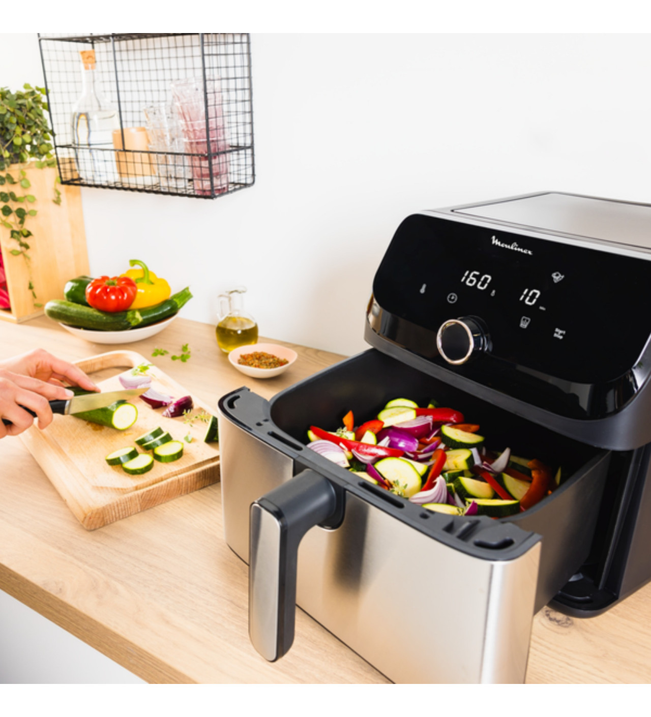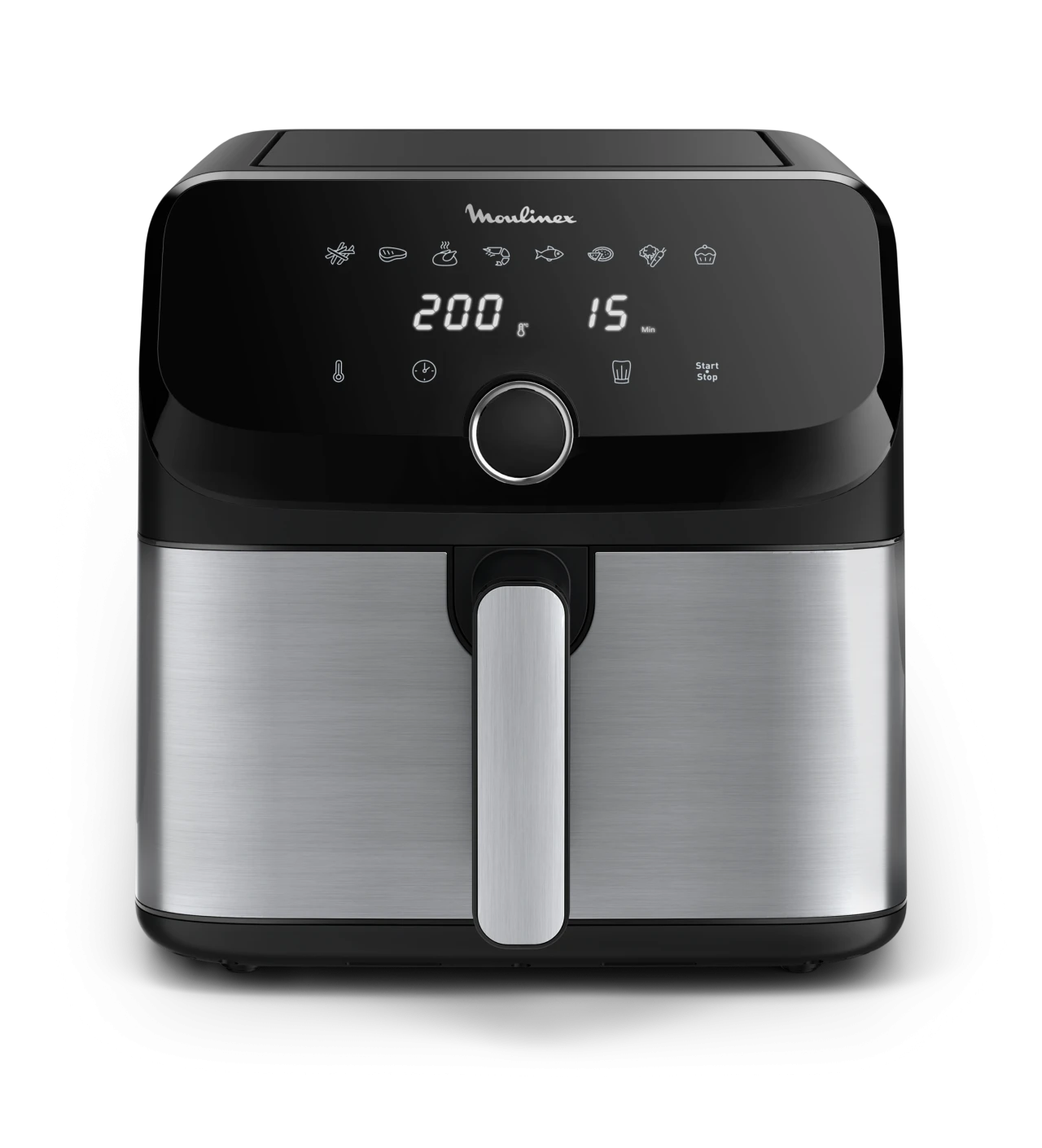 Vous trouverez dans cet appareil compact une multitude de fonctions pour réaliser tout autant de cuissons différentes. Avec une grande capacité de 7,5 L, cette friteuse sans huile vous permet de régaler toute une famille sans problème. Que vous choisissiez un des 8 programmes prédéfinis, ou que vous sélectionniez manuellement vos paramètres, l’air fryer Moulinex vous garantit une cuisson de qualité.