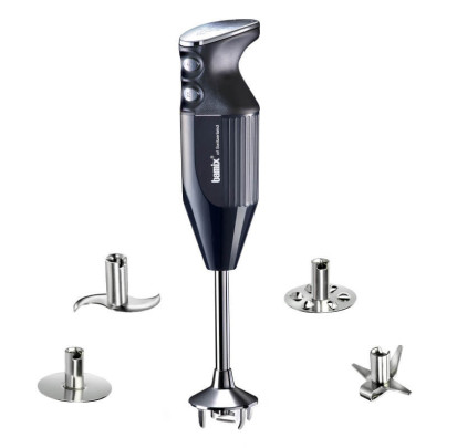 Si vous cuisinez souvent, le mieux est encore de se tourner vers un mixeur plongeant doté d'un support, à l'instar du Bamix. Fabriqué en Suisse, l'appareil dispose d'un support qui permet de ranger les accessoires et de le maintenir à la verticale pour toujours l'avoir à portée de main. Très silencieux, le mixeur plongeant Bamix consomme peu d'énergie et dispose de nombreux accessoires qui vous permettront de vous passer d'un robot de cuisine.