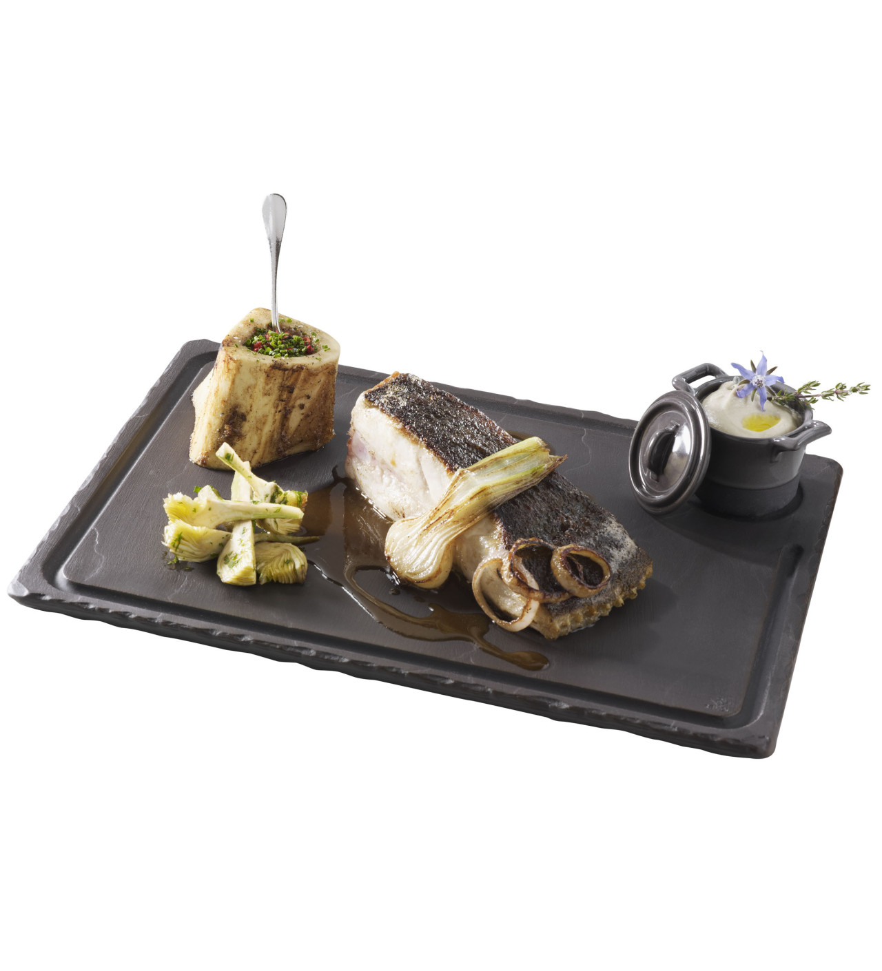 Basalt : Cette collection comprend des assiettes, des plateaux et des bols pour une présentation créative. La collection Basalt imite parfaitement l'ardoise tout en préservant les nombreux avantages de la porcelaine. Avec ces lignes à la fois sobres et finement travaillées, les ustensiles Basalt seront aussi bien appréciés au restaurant que chez vous!