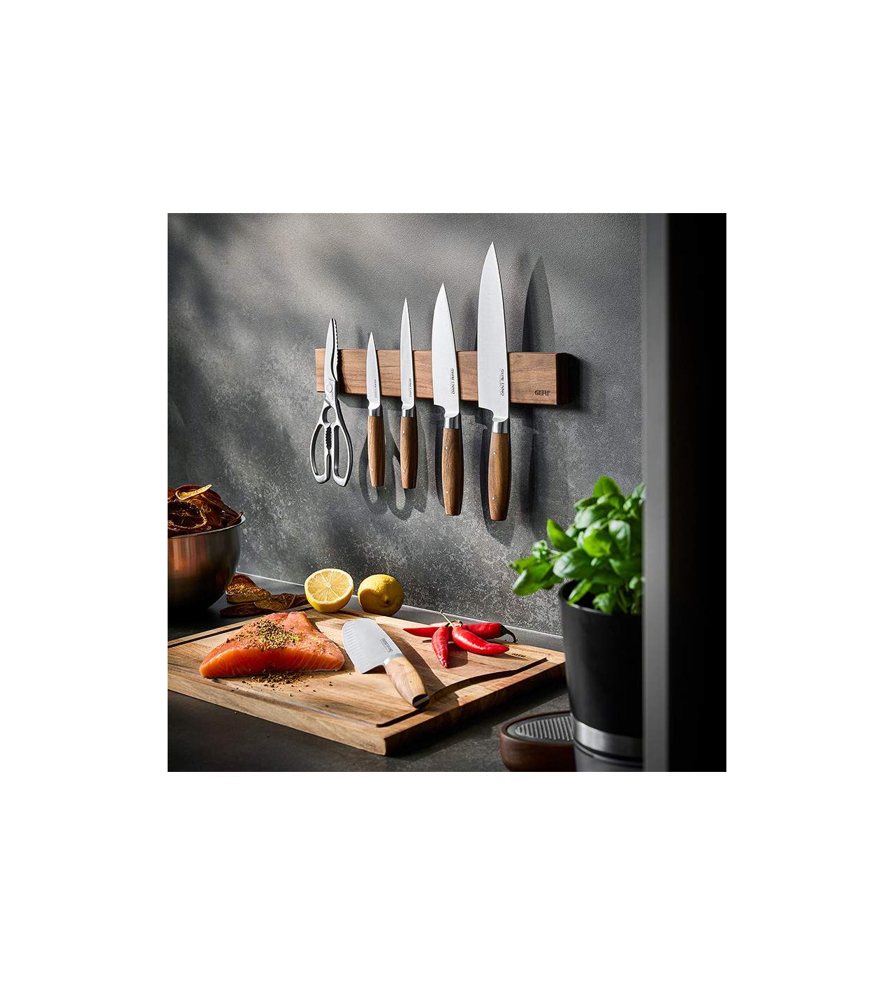 La barre à couteaux Gefu est habillée de bois de noyer pour lui donner un côté plus naturel qui se fondra dans le décor de toutes les cuisines.