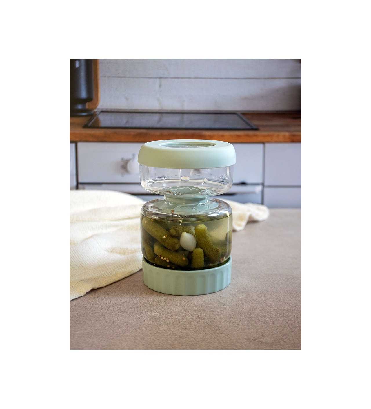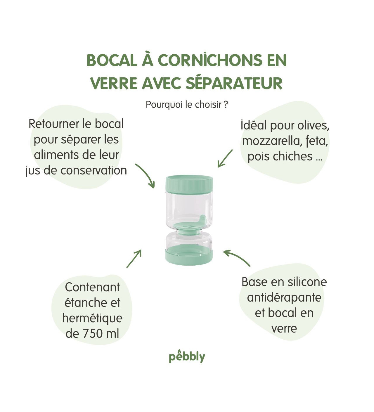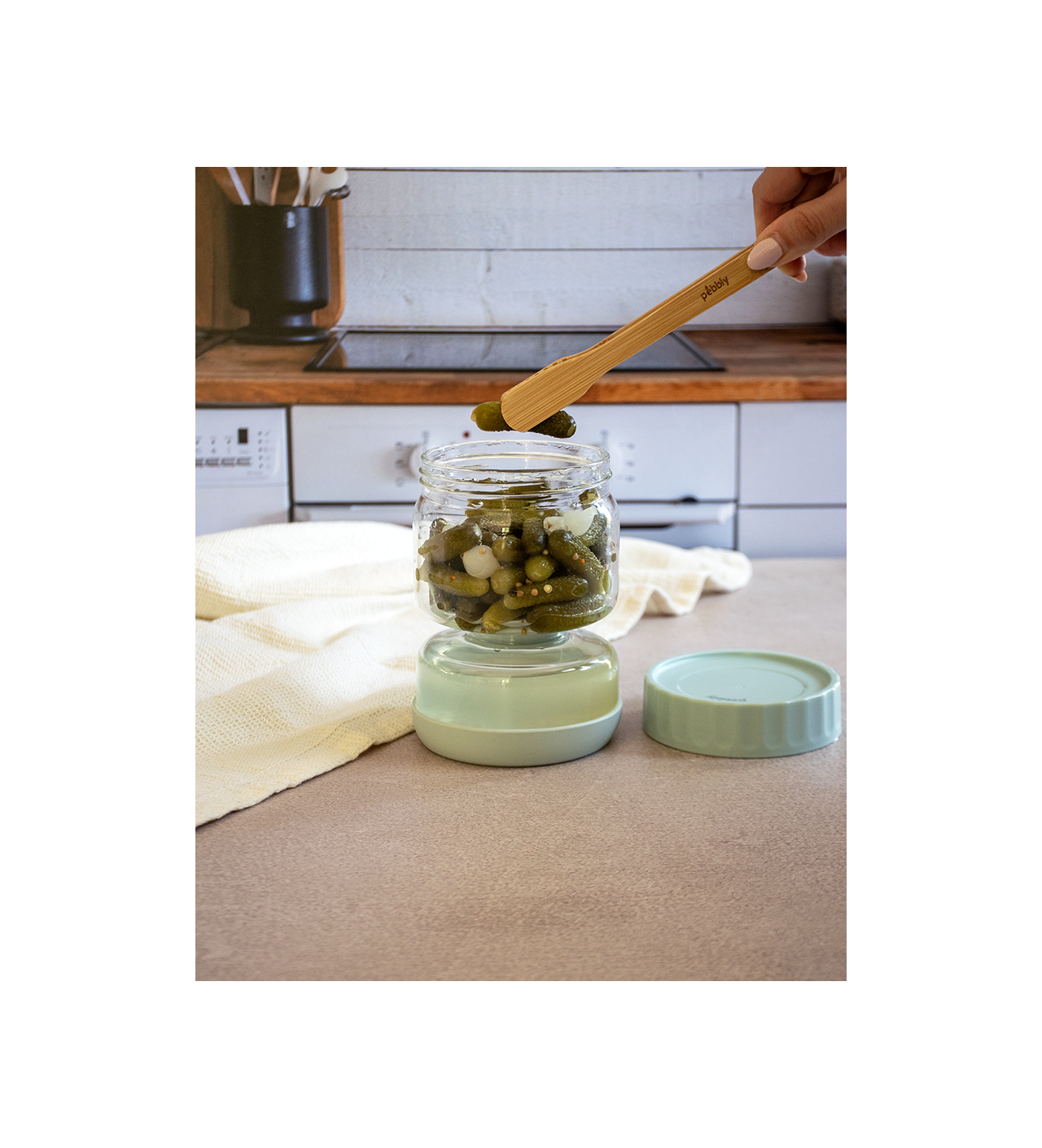 Le bocal pour cornichons Pebbly profite aussi d'une base antidérapante et son couvercle est parfaitement hermétique. Rien ne vous empêche de faire usage de ce bocal pour y conserver des olives, de la feta, ou encore des pois chiches.