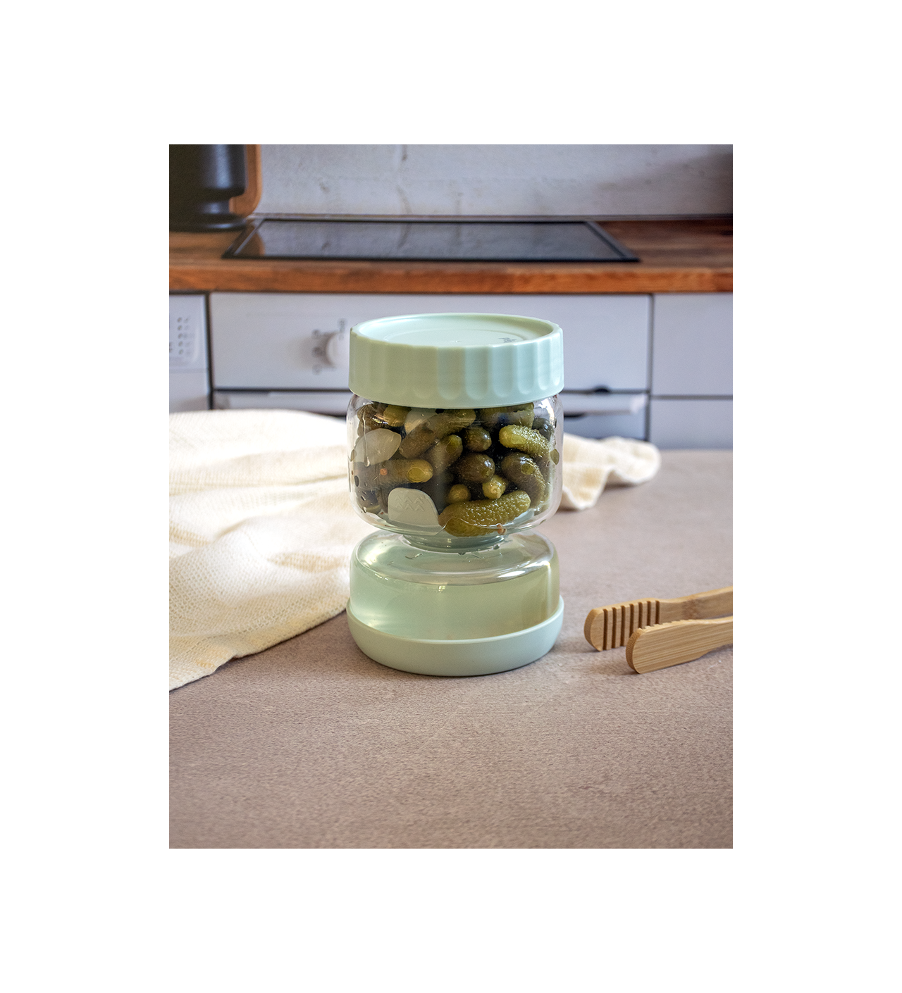 La forme originale de sablier de ce pot à cornichons permet en le retournant d'écouler le vinaigre et d'ainsi saisir les cornichons sans avoir à mettre les mains dans le vinaigre. Ce système ingénieux permet aussi d'éviter de perdre les cornichons au fond du pot.