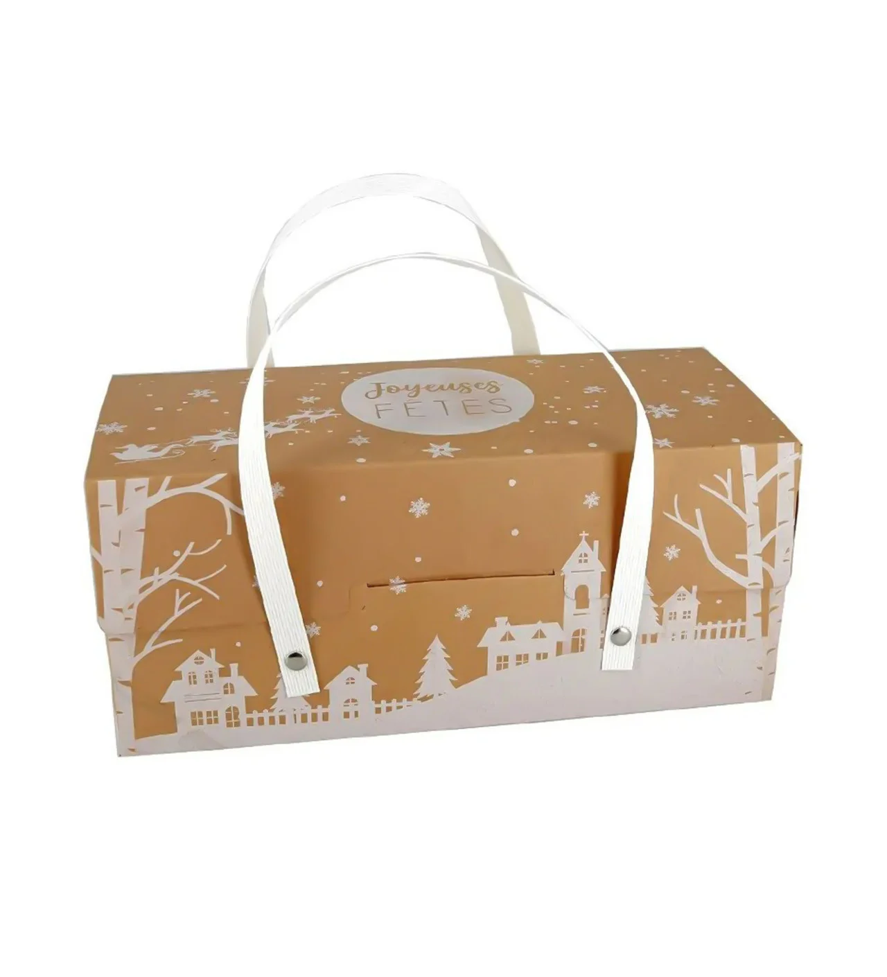 Fabriquée en kraft, cette boîte à bûche séduit par son aspect brut et chaleureux. Son délicat décor de village de Noël blanc sur fond kraft évoque une ambiance hivernale pleine de poésie, idéale pour accompagner vos desserts faits maison.