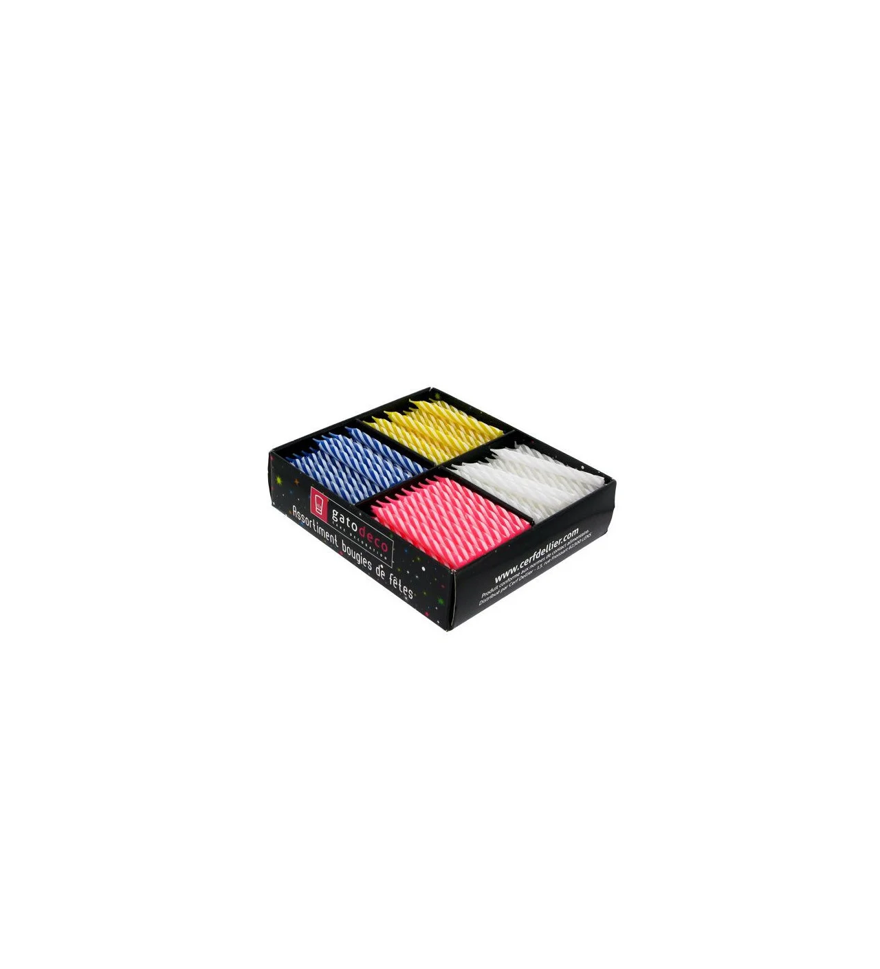 Embellissez votre gâteau et rendez l'anniversaire de l'intéressé inoubliable ! Donnez le ton de la fête avec cet assortiment de Bougies Torsadées Fines Assorties Gatodéco. Le lot est vendue dans une boîte pratique, de 250 pièces, en 4 couleurs assorties :