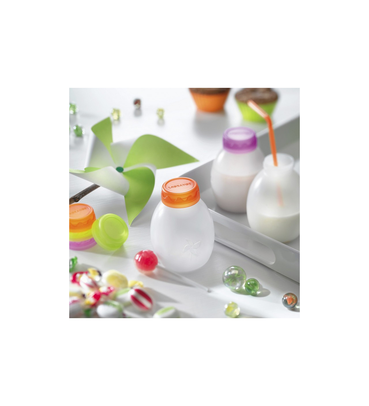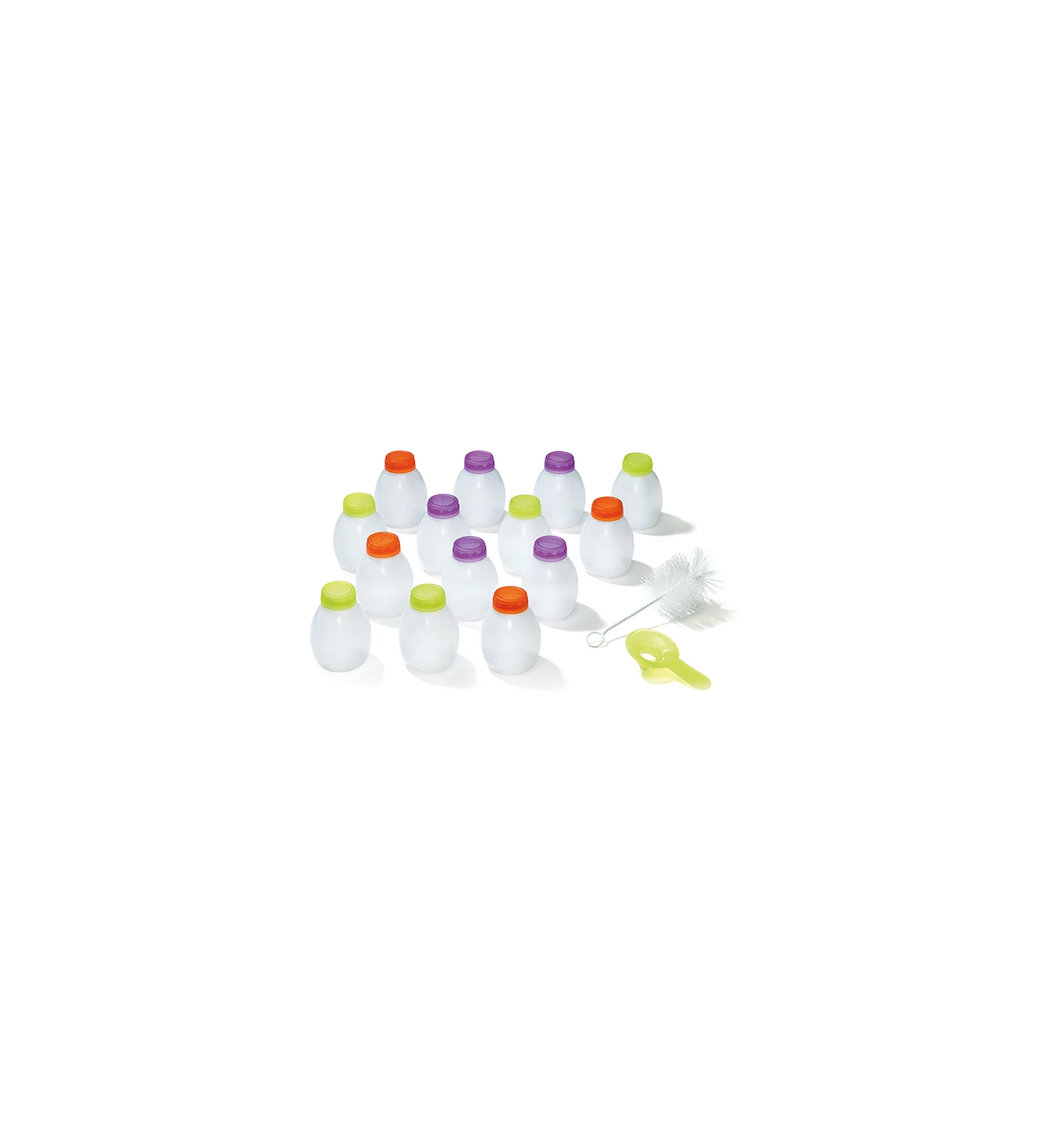 Vous faites vos yaourts maison ? Variez les plaisirs et confectionnez vos yaourts à boire. Aidez vous du livret de recettes pour découvrir de nouvelles saveurs de yaourts maison à essayer sans plus tarder. Ce lot de 14 bouteilles vous permet de faire de vos yaourts à boire : des yaourts nomades à emporter partout. Les 14 bouteilles sont munies de bouchons colorés afin de facilement les repérer que ce soit dans votre réfrigérateur ou votre sac.