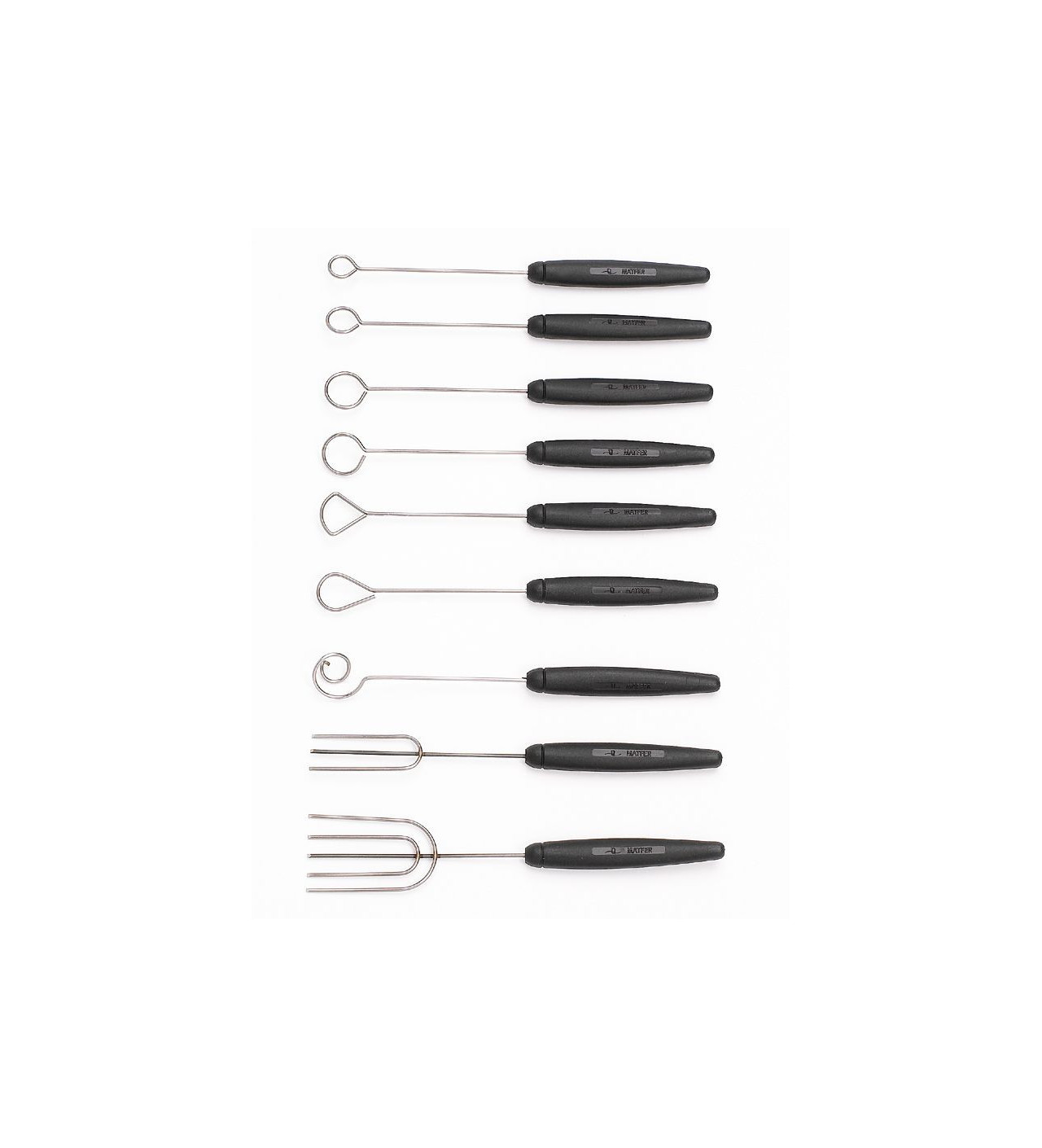 La broche à tremper est utilisé pour tremper des préparations en confiserie ou des fruits dans du chocolat en évitant de laisser des marques. La broche à tremper permet de réaliser un enrobage chocolat parfait et sans trace.