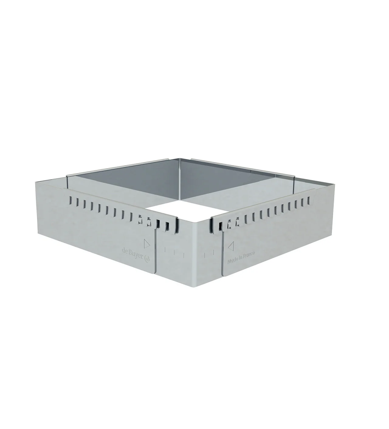 Conçu pour les professionnels comme pour les particuliers, le cadre pâtisserie inox De Buyer possède des crans de fixation sur le dessus et à l'extérieur. Ainsi, la totalité du cadre réglable pâtisserie De Buyer est en contact avec la plaque de cuisson, ce qui le rend totalement étanche (à condition de ne pas y verser des préparations liquides). De plus, cela assure à la préparation une surface parfaitement lisse.