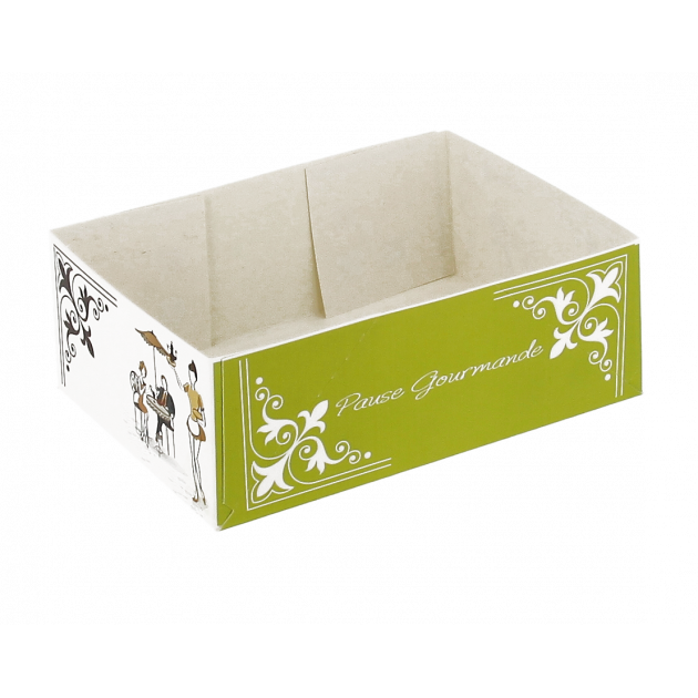 Ces caissettes pâtissières sont décorées à l'aide d'un visuel élégant et sobre. Ces boîtes cartonnées sont fabriquées en France.