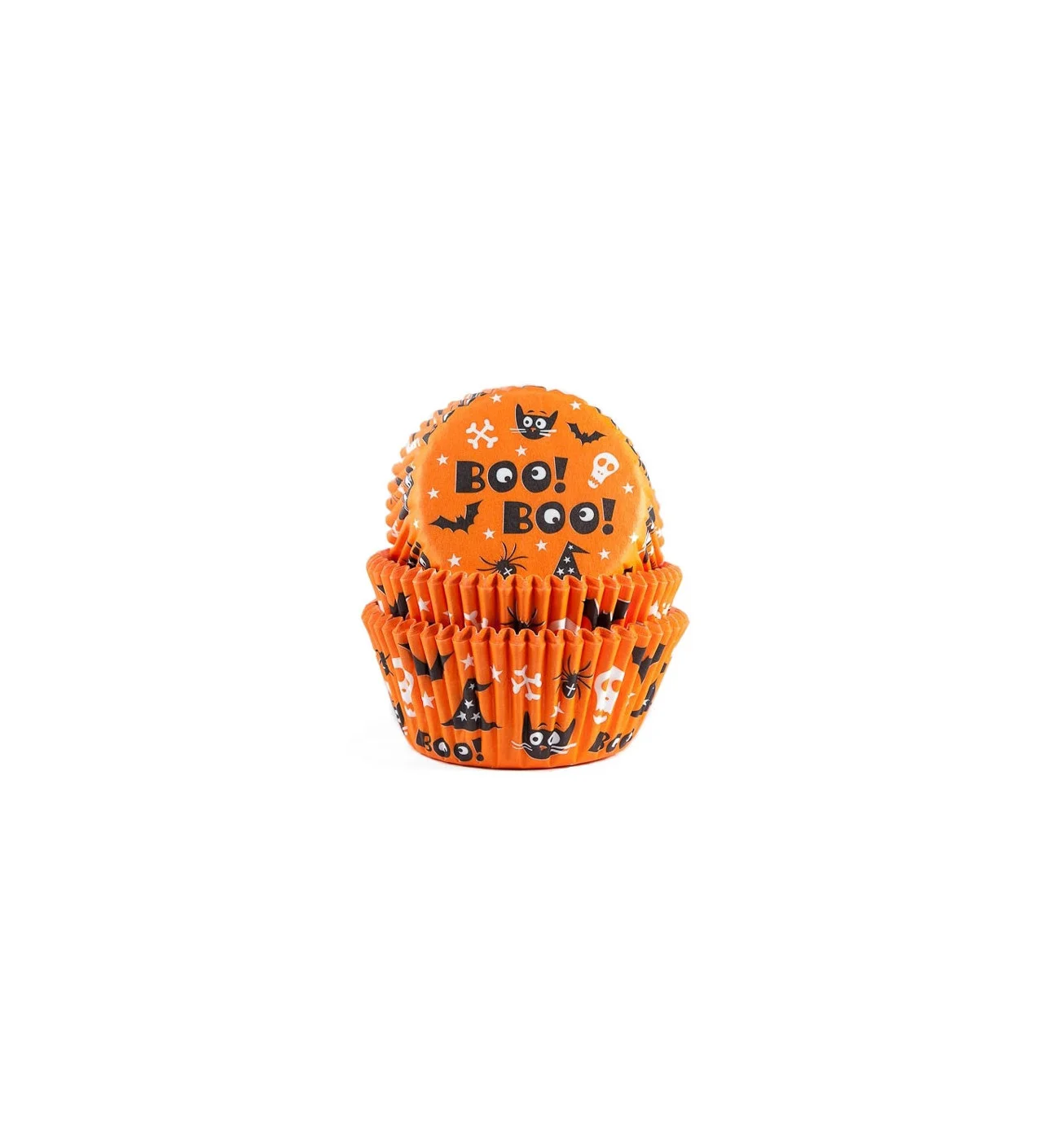 Adorables de caissettes de couleur orange, imprimées de motifs Halloween : chapeaux de sorcière, araignées, chauves-souris... Elles feront le succès de vos gâteaux pour votre soirée d'Halloween.