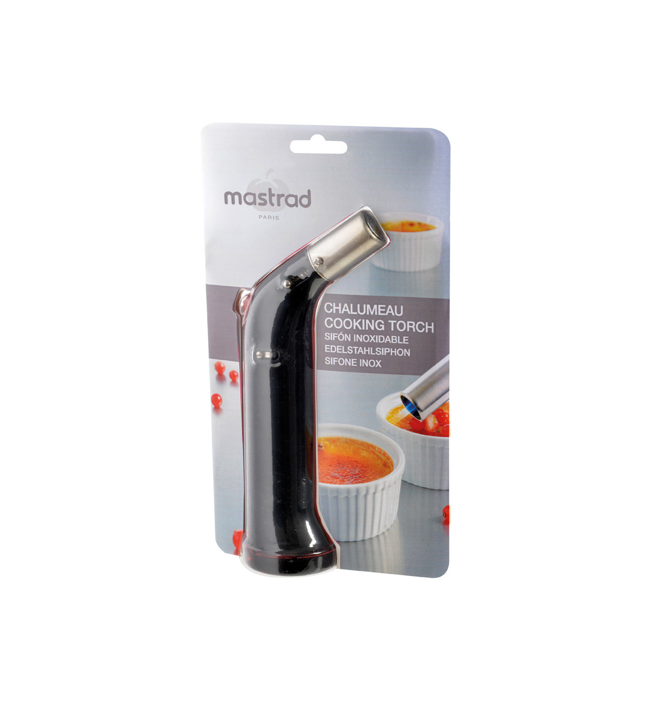 Avec sa base anti-dérapante, sa flamme réglable et sa sécurité enfant, ce Chalumeau à Gaz offre une utilisation 100% sécurisée. Une simple pression sur le bouton allume la flamme, à vous de la régler à la puissance voulue. Sa fonction continu permet de maintenir la flamme sans pression. Le chalumeau à gaz dispose d'une capacité de 22 ml. Il se recharge avec du gaz à briquet ou bien la recharge Mastrad F46350.
