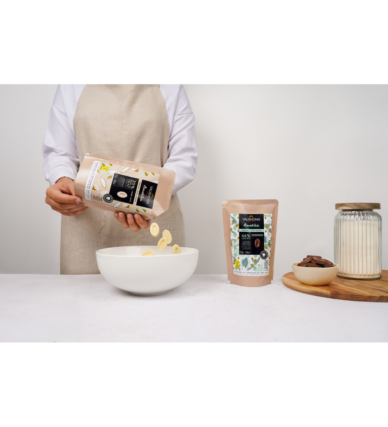 Les notes de cacao, de céréales, et d'amande grillée du chocolat au lait Amatika permettent de l'associer à une multitudes d'ingrédients tels que la fleur d'oranger, le jasmin, la pâte d'amande, la banane, le citron, ou la pêche par exemple.