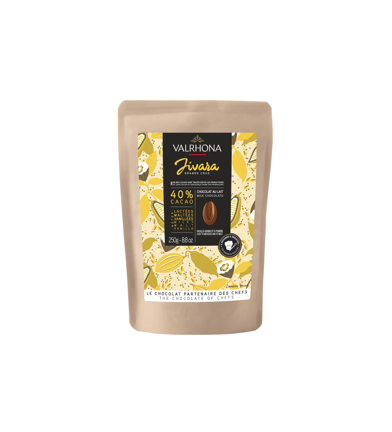 Laissez-vous séduire par un chocolat au lait à la force gustative puissante et au véritable goût de cacao. Elaboré en 1995, les fèves Jivara 40% de la Maison Valrhona font parties de la collection Grands Crus et sont issues d'un assemblage complexe de profils aromatiques de cacaos typiques d'Equateur et du Ghana.