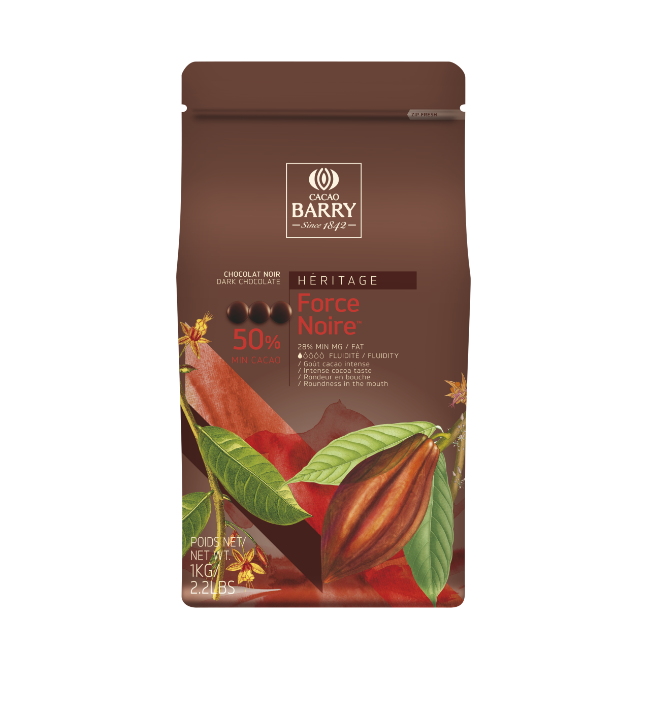Sac de chocolat en pistoles Force Noire 50% Barry 5kg. Sac refermable grâce à un zip pour une protection optimale des saveurs.