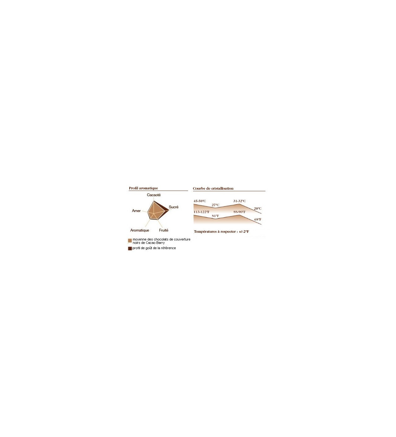 Ce chocolat d'un noir intense s'accordera parfaitement avec : Caramel, Café Arabica de Java, Fleur de Sel, Cerise Noire, Framboise, Poire, Banane, Abricot, Vieux Rhum, Côtes Du Rhône, Pain.