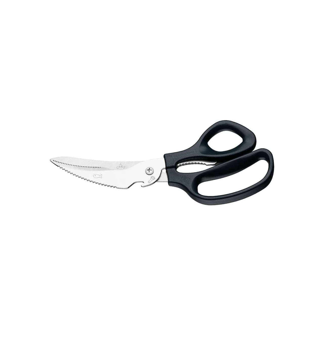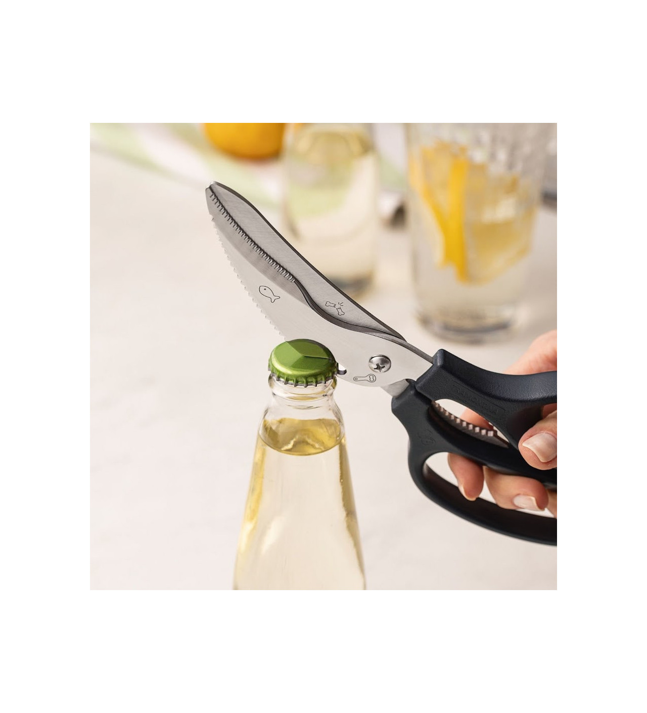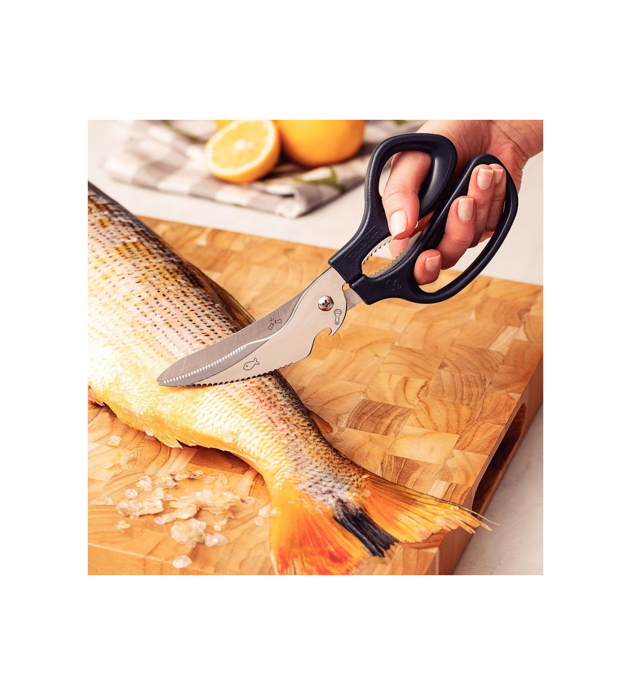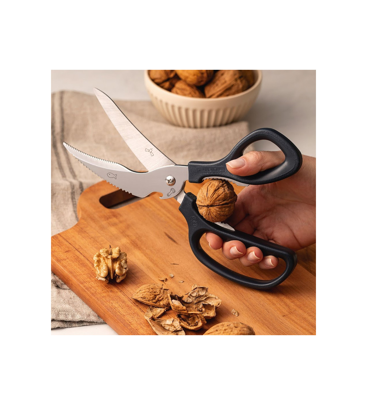 Cette paire de ciseaux alimentaire se révèle parfaite sous toutes les coutures. Grâce à sa polyvalence, elle deviendra rapidement indispensable dans votre cuisine. Elle réunit à elle seule la possibilité de décapsuler, casser des noix, couper des volailles, mais aussi d’écailler les poissons frais que vous aurez achetés plus tôt dans la journée...
