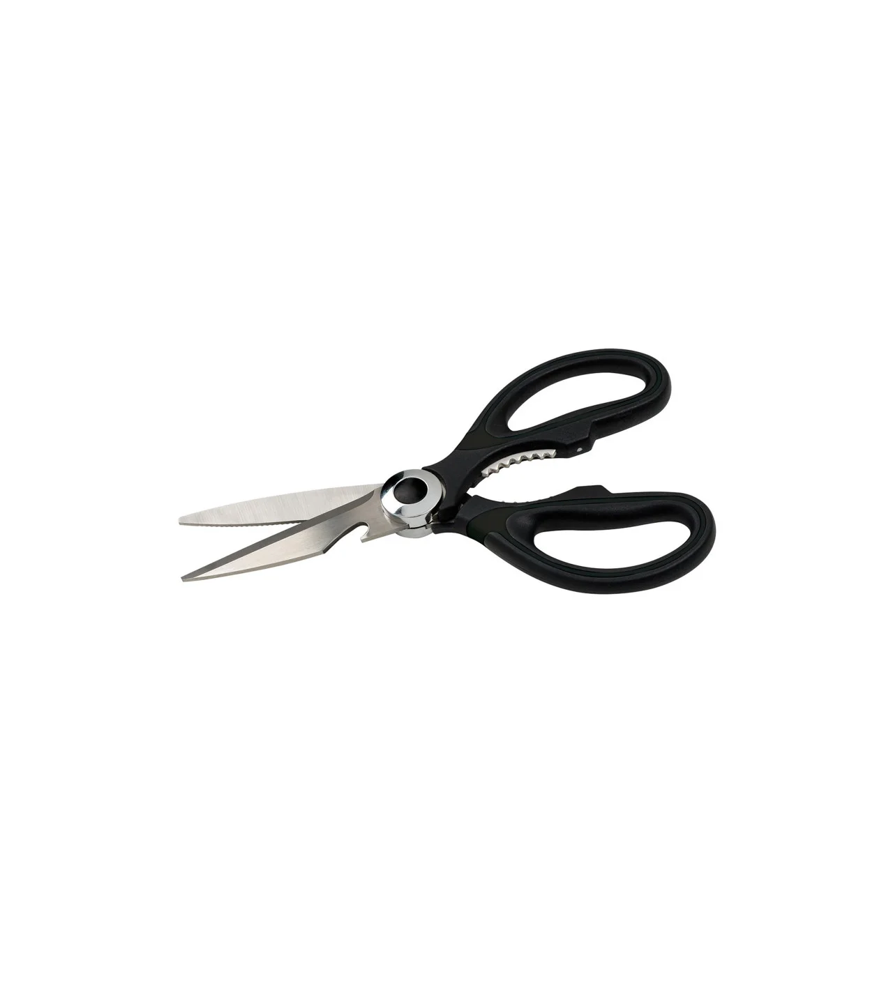 Ce ciseaux de cuisine tous usage Boj va vous permettre de tailler, émincer, découper, parer vos viandes, poissons et autres aliments. Les lames du ciseaux sont crantées pour une meilleur accroche des éléments à couper, et pour faciliter son utilisation. Son anneau central est utile pour deviser une bouteille ou un bocal difficile à ouvrir.