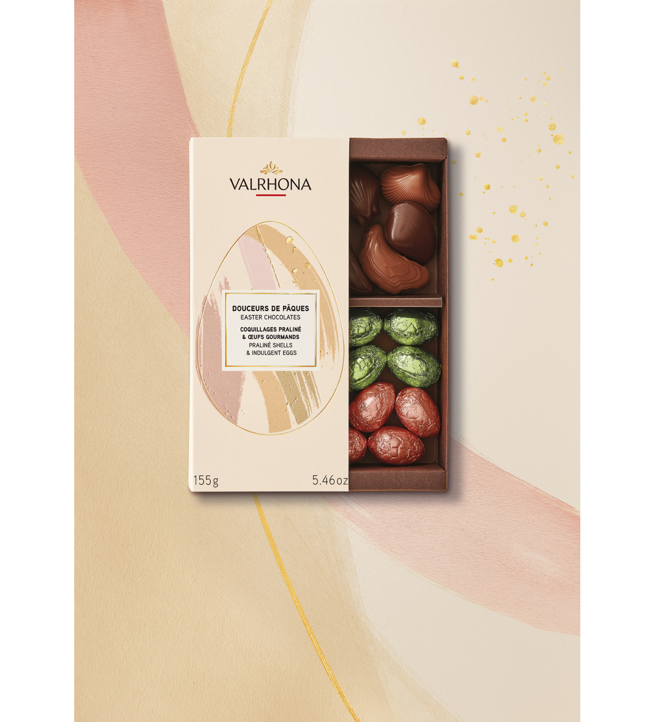 Présenté dans un coffret chocolat en deux compartiments, cet assortiment Valrhona généreux réunit fritures et œufs en chocolat, sublimés par des recettes aux textures fondantes et aux cœurs pralinés délicats.