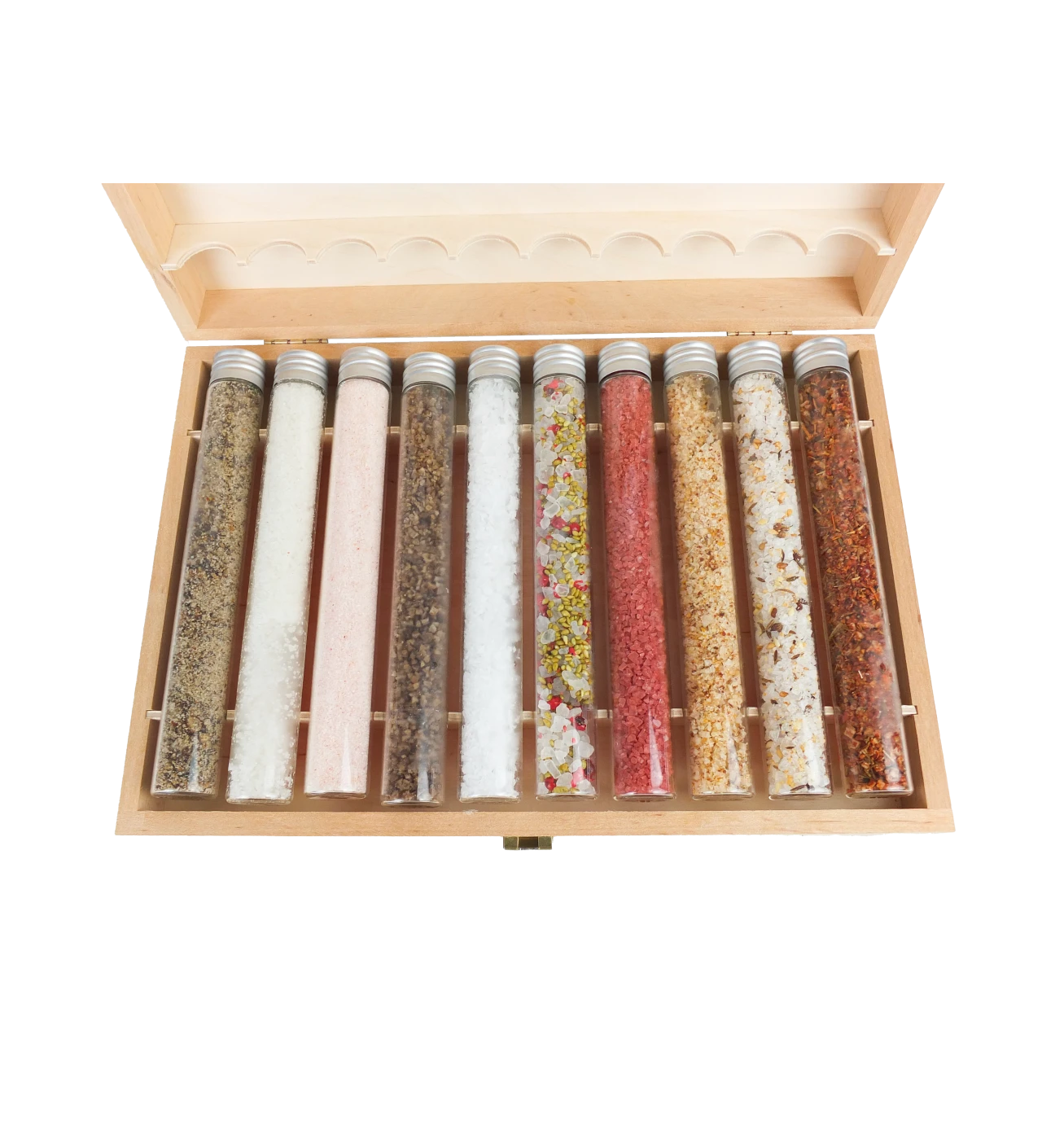 Faites plaisir à tous les coups grâce au Coffret Cadeau 10 Sels Un Jour Une Épice. Chaque sel est présenté dans un tube en verre et se trouve enfermé dans un élégant coffret en bois.