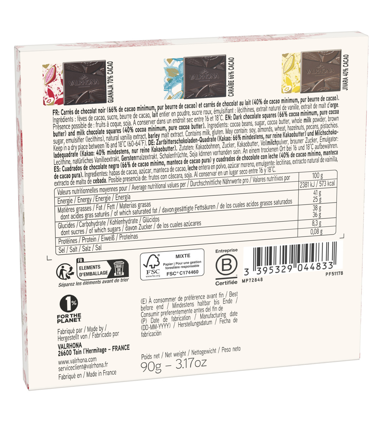 Dans ce coffret de Noël élégant, vous découvrirez 18 carrés de chocolat d'exception, parfaits pour savourer chaque instant des fêtes. Cet assortiment met en vedette trois chocolats Valrhona incontournables : 6 carrés de chocolat au lait Jivara doux et crémeux, 6 carrés de chocolat noir Caraïbes intense et fruité, et 6 carrés de chocolat noir Guanaja riche et intense, pour satisfaire tous les palais.