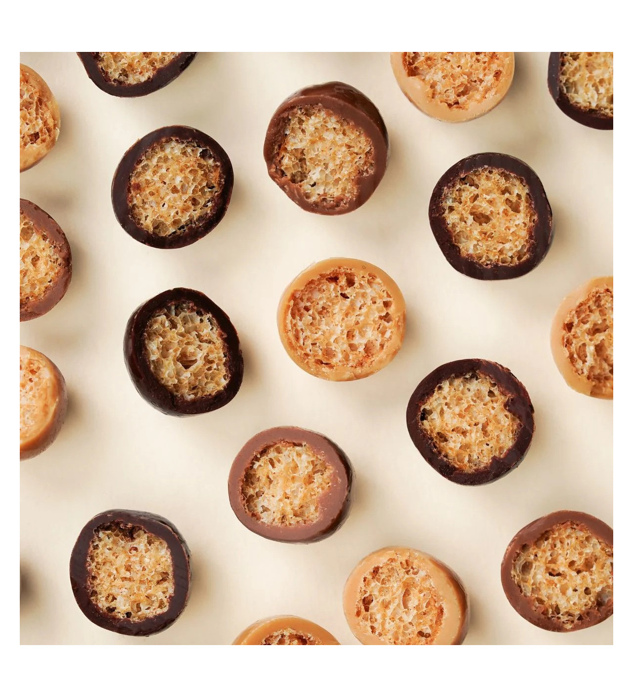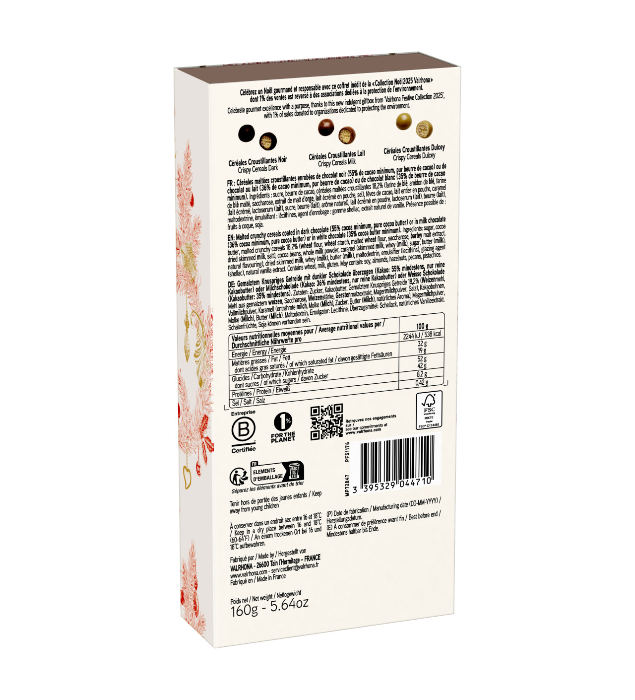 Dans ce coffret cadeau, Valrhona vous offre un assortiment irrésistible de croustibilles chocolatées, où les céréales croustillantes se marient à la perfection avec des enrobages chocolat noir, chocolat au lait, et de délicieux chocolat Dulcey, pour une expérience chocolatée divine.