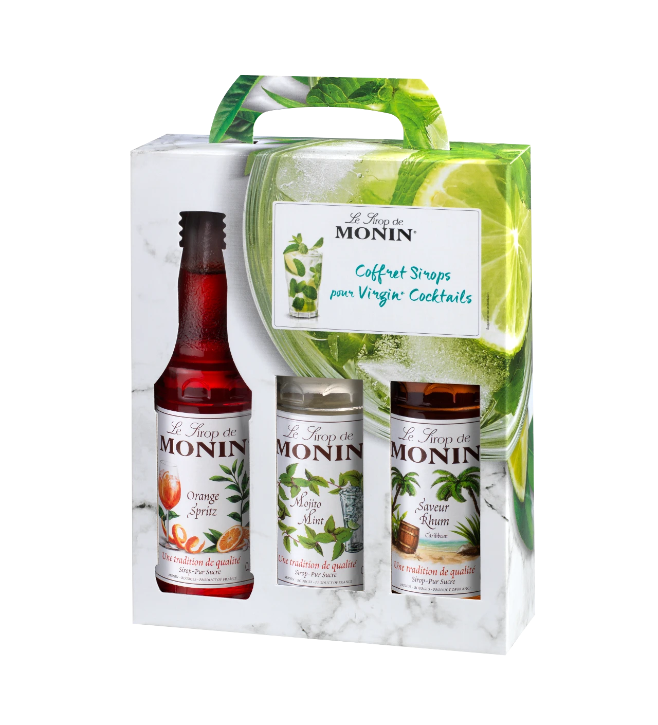 Pour tous ceux qui aiment le goût de certains cocktails mais ne boivent pas d’alcool, ou pour ceux qui essayent de réduire leur consommation, Monin a pensé pour vous le coffret de sirops parfait. Comportant trois bouteilles de sirops de 25 cl, ce coffret Monin est parfait pour recréer les cocktails les plus en vogue sans y mettre une goutte d’alcool.