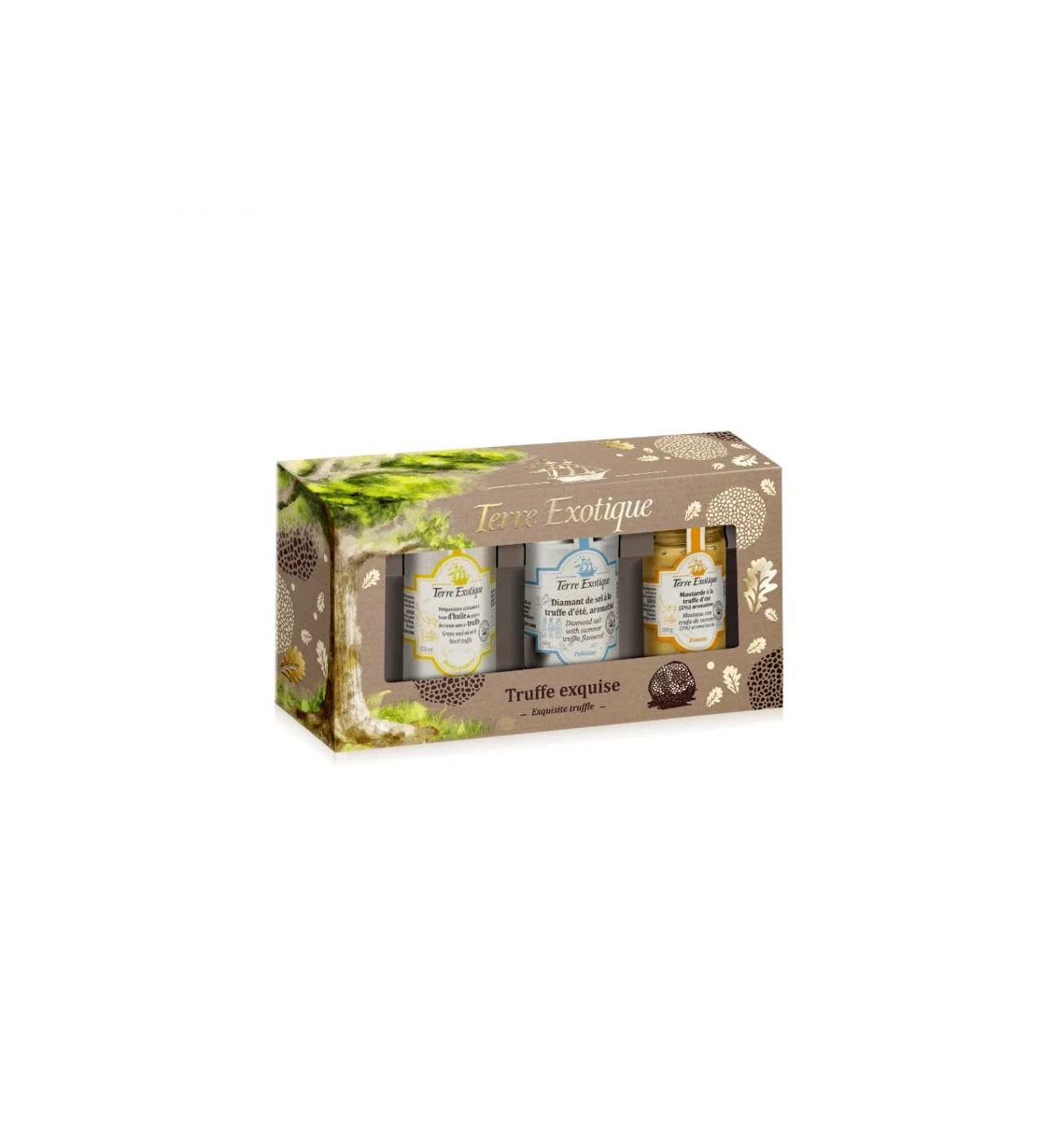 Ce Coffret Épices de 3 Assortiments Truffe Exquise Terre Exotique, rassemble différents produits pour découvrir les différentes facettes de la truffe, il y inclut de l’huile de pépins de raisin à la saveur de la truffe, parfait pour assaisonner vos salades, du diamant de sel à la truffe d’été aromatisé idéal pour saupoudrer vos plats, et enfin, une moutarde à la truffe d’été, la touche qui pourra différencier vos vinaigrettes.
