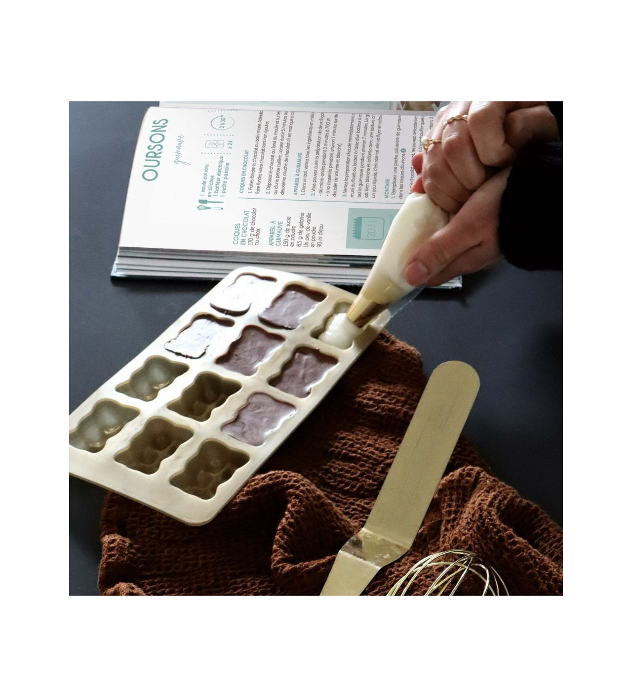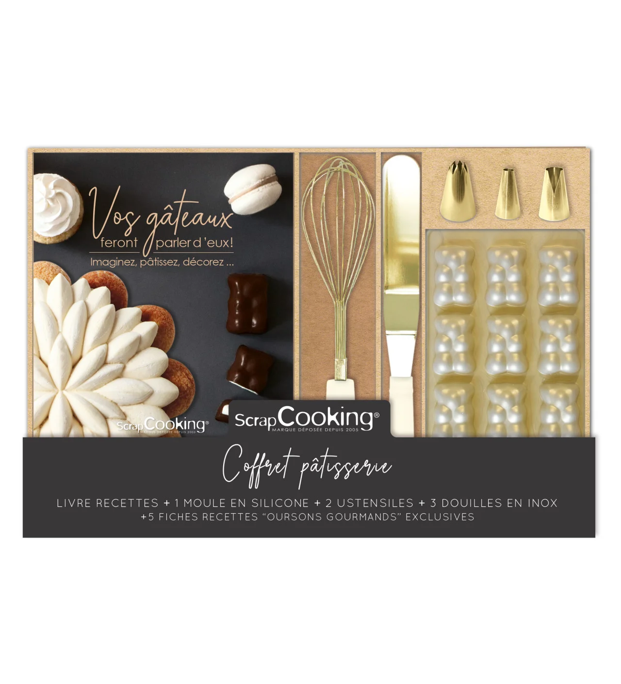 À l’intérieur de ce coffret Scrapcooking, vous découvrirez un livre de recettes regroupant les plus belles inspirations culinaires de la marque, ainsi que de magnifiques ustensiles de pâtisserie. Entre le fouet, la spatule coudée, les douilles, et le moule à oursons en silicone, vous aurez de quoi confectionner une multitude de gourmandises.