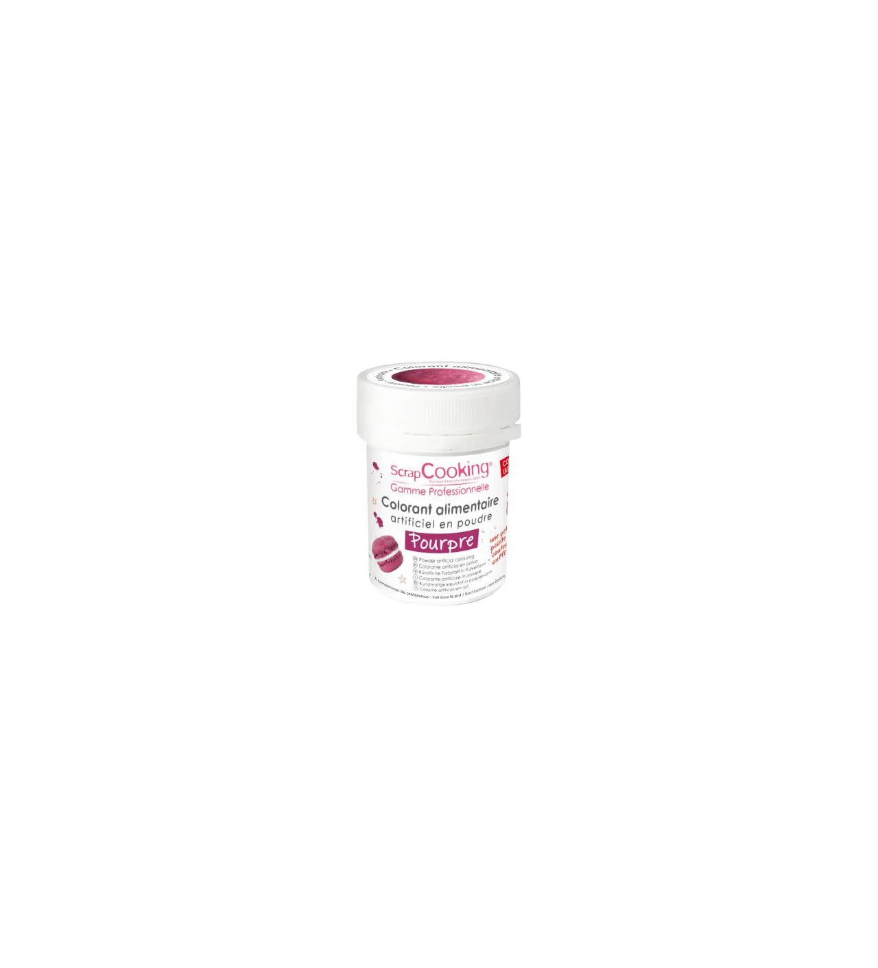 Cette poudre colorante donnera la couleur Fushia foncé - pourpre à vos macarons, meringues, crèmes et autres plaisir sucrés! Grâce à la qualité professionnelle du produit, une seule pincée suffit pour colorer votre dessert!