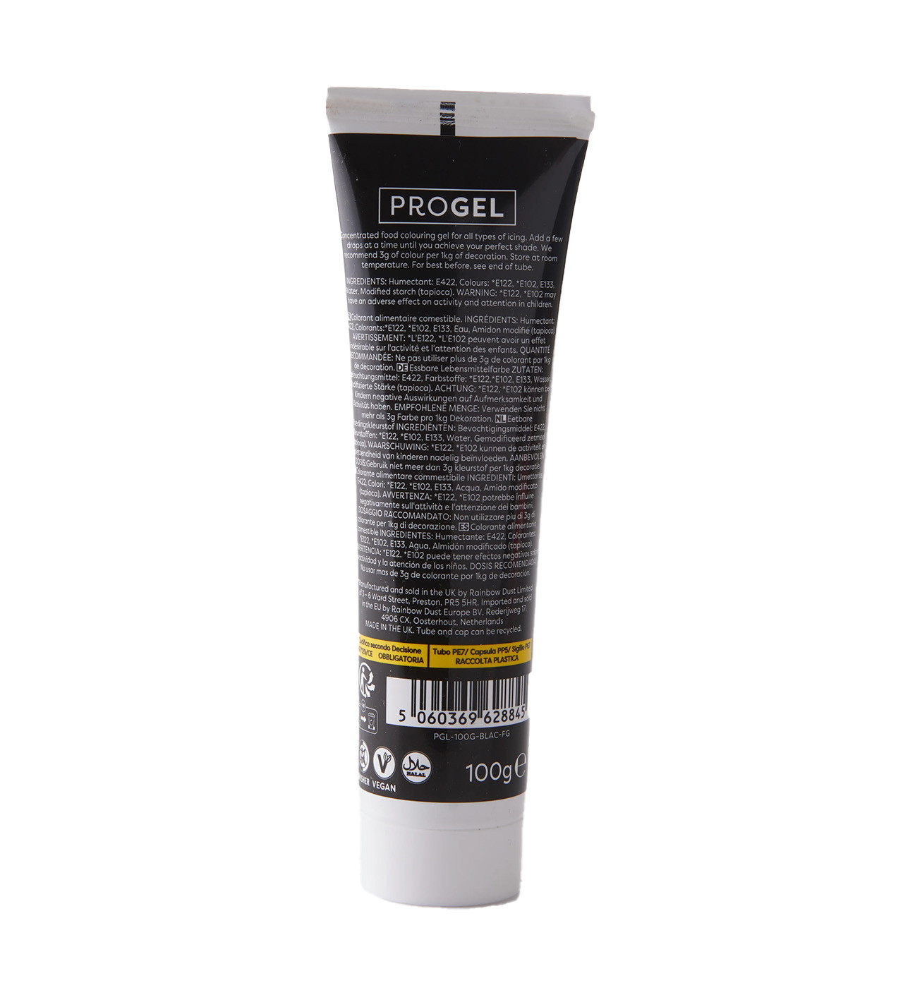 Sortez des sentiers battus et apportez une touche audacieuse et moderne à vos créations avec le Colorant Alimentaire ProGel Noir 100 g Rainbow Dust.