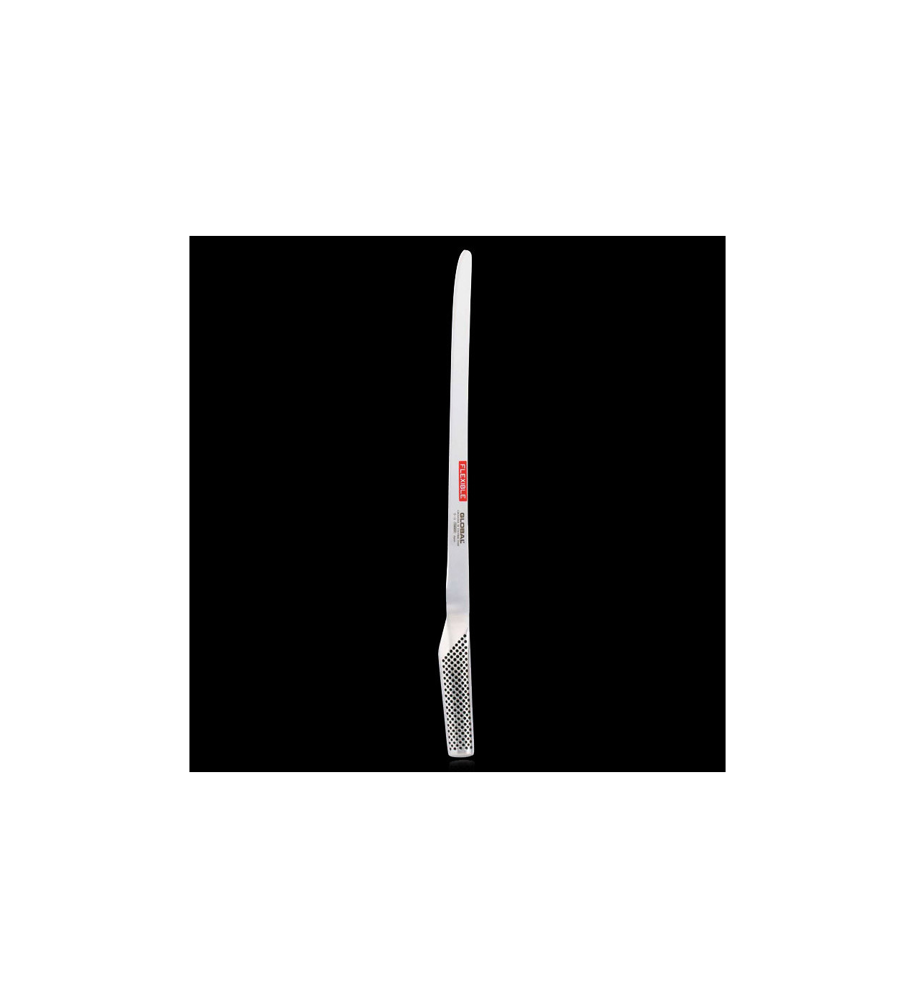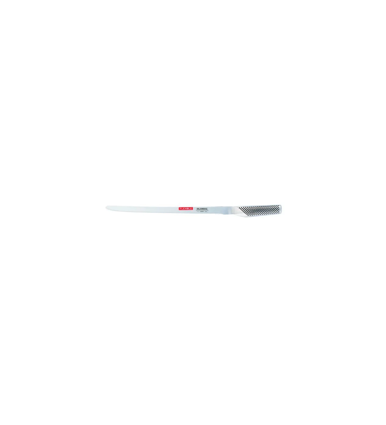 La lame du couteau Global G10 est flexible unie, idéale pour la décooupe des jambons et saumons.