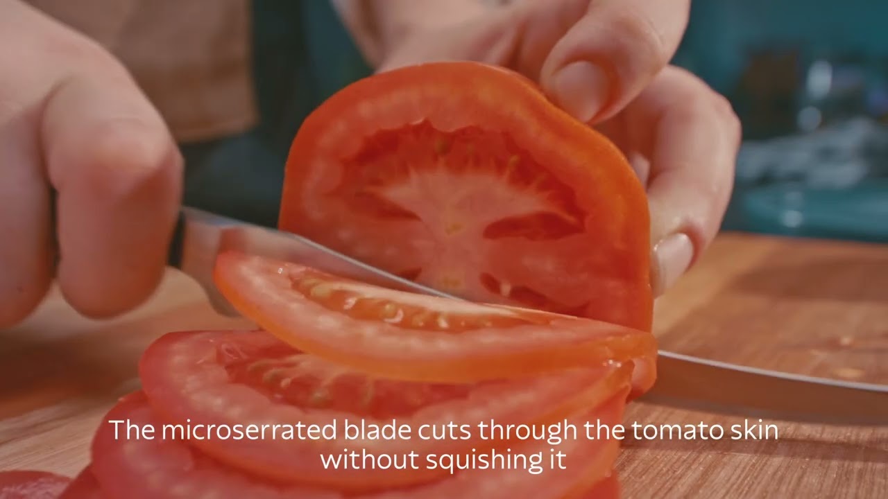 Ce couteau de cuisine a été spécifiquement conçu pour respecter la chair délicate de ce fruit écarlate. Il possède une longue lame finement dentée qui permet de peler la peau de cet aliment et de le découper soigneusement, quelle que soit sa taille. Grâce à sa pointe, il rend également plus facile l’extraction du cœur de la tomate, minimisant ainsi les pertes et préservant la chair intacte.