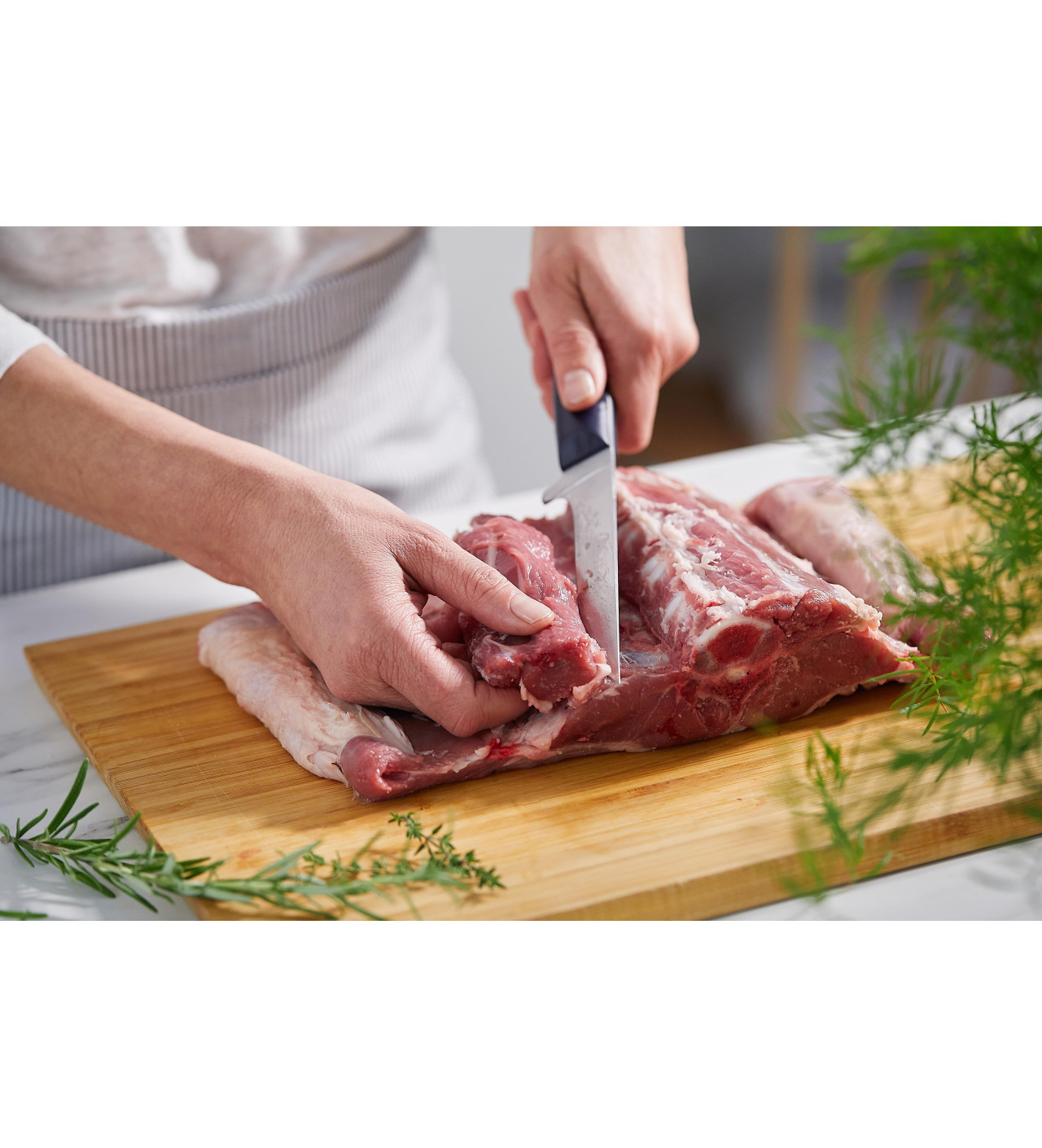 En ce qui concerne le manche du couteau à viande, il est composé d’un polymère résistant à la chaleur, l’eau et aux chocs. Il est tout aussi confortable à prendre en main qu’il est hygiénique, un prérequis essentiel lorsqu’il s’agit de la préparation de viande.