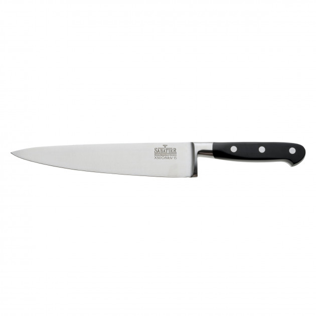 La longue lame de 20 cm est fixée par 3 rivets sur un manche en ABS noir. Ce Couteau de Chef V Sabatier s'utilise au quotidien et vous facilitera de nombreuses découpes.