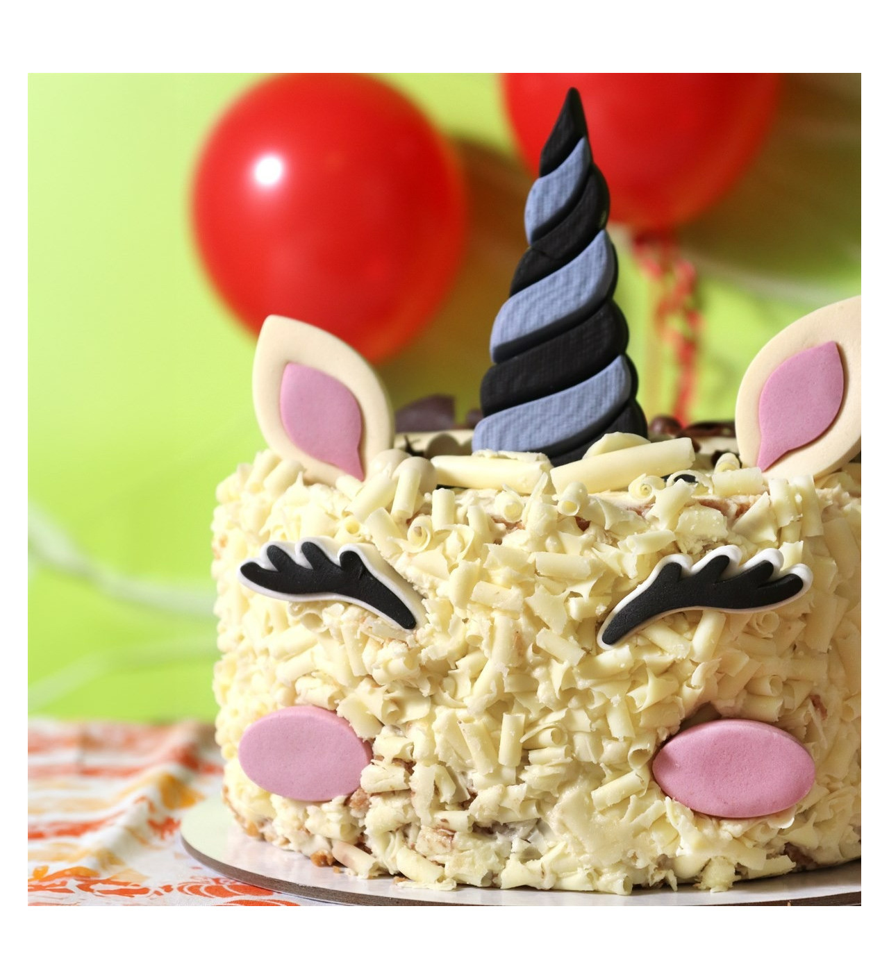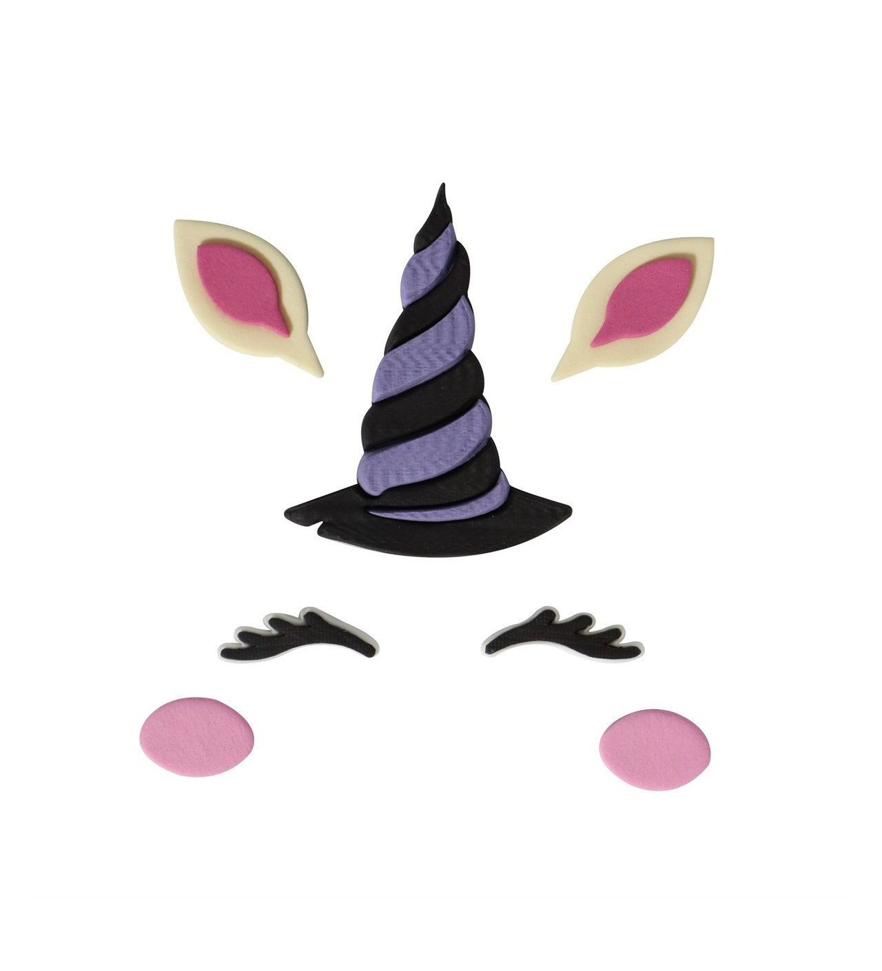 Grâce à ses décors en sucre, transformez votre gâteau en une licorne aussi magique qu’ensorcelante. Sa corne violette et noire façon chapeau de sorcière apporte un côté sombre et original, tandis que les yeux, oreilles et joues aux teintes noir, rose et blanc donnent vie à un personnage à la fois mignon et mystérieux.