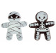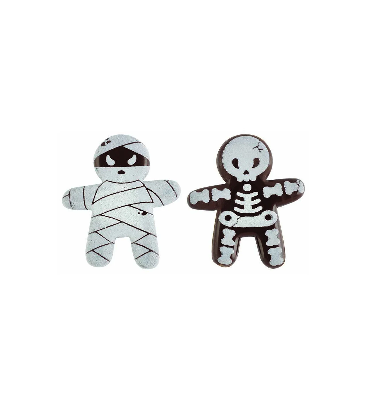 Ce duo de bonshommes de pain d'épice se déguise pour Halloween en mythique momie et en traditionnel squelette d’Halloween ! En plus d'être adorables, ces bonshommes de pain d'épice en chocolat sont ornés de motifs imprimés blancs qui leur apportent des détails réalistes. Vous retrouverez notamment des subtiles déchirures au niveau du tissu de la momie, son regard mécontent, des fissures sur les os du squelette et son regard vide.