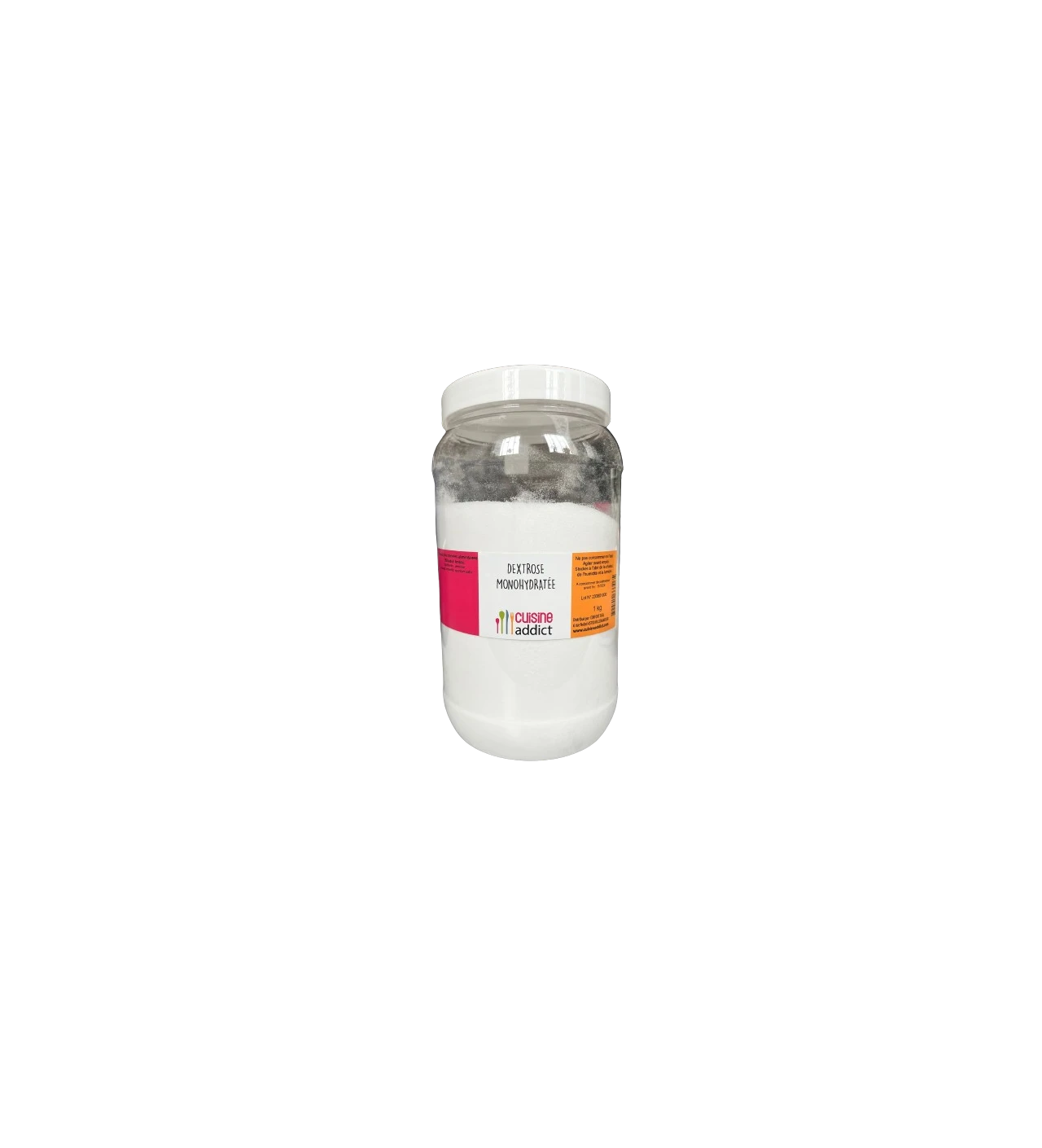 Le dextrose Cuisineaddict est une poudre blanche légèrement cristalline et au goût faiblement sucré. Selon la préparation, le dosage recommandé est de 3 à 5%.