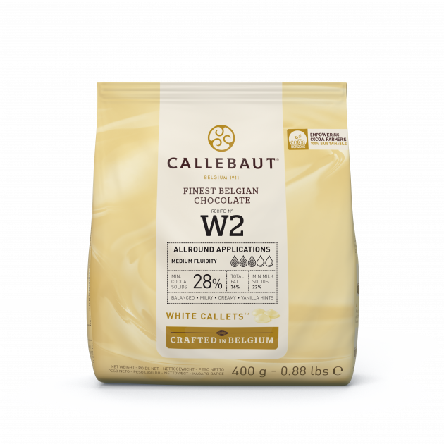 Le Chocolat Blanc W2 s'associera parfaitement avec de nombreux ingrédients qu'ils soient acide, amer, épicé ou fruité. D'une fluidité intermédiaire, le Chocolat Blanc 28% W2 Callebaut est un chocolat blanc polyvalent qui pourra être utilisé aussi bien pour la réalisation de barres chocolatées, de mousses, de crèmes glacées ou de boissons. Sa couleur brillante et satinée saura séduire au premier regard avant que le croquant et les saveurs du chocolat W2 ne fassent le reste.
