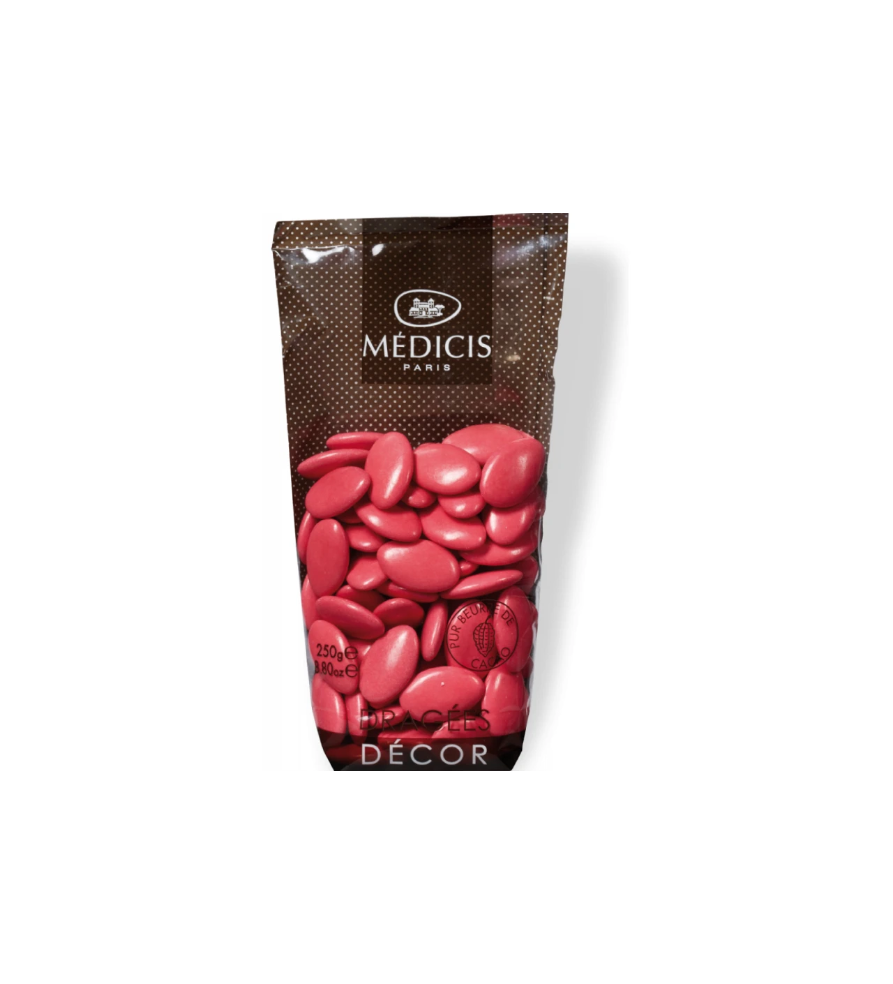 Les Dragées Médicis au Chocolat Noir 70% sont enrobées d'une fine couche de sucre rouge magenta. Ces 250 g de Dragées en forme d'amande apporteront de la couleur sur vos tables de fête.