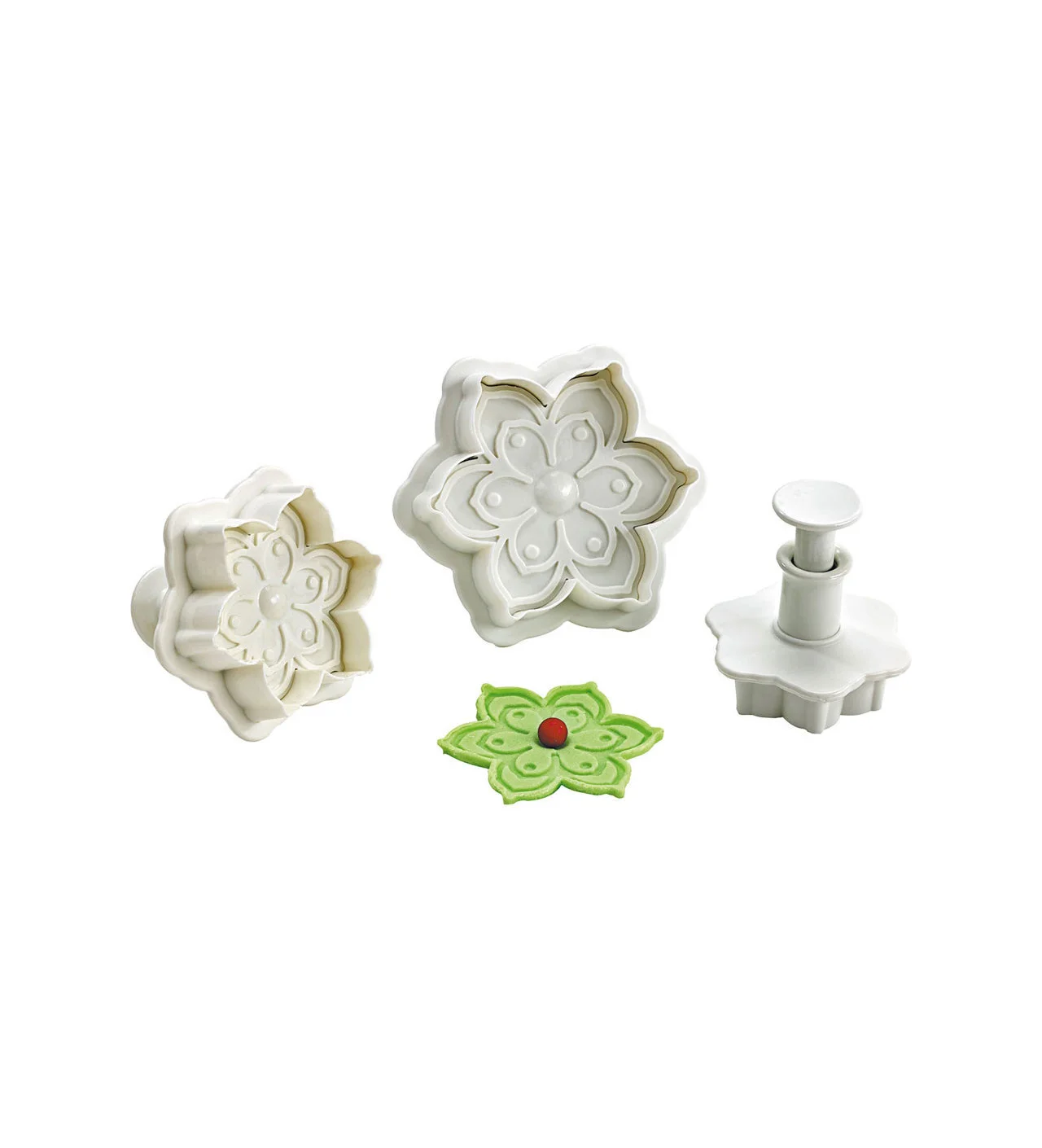 Décoration régulière, finesse des détails : vous aussi vous aimeriez que vos gâteaux ressemblent à des oeuvres d'art ? Pour cela, optez pour l'emporte pièce fleur. En une pression, il dessinera sur la pâte une jolie fleur aux pétales pointus, ornés d'un motif. L'emporte pièce est décliné sous 3 diamètres différents : 40, 55, 70 mm.