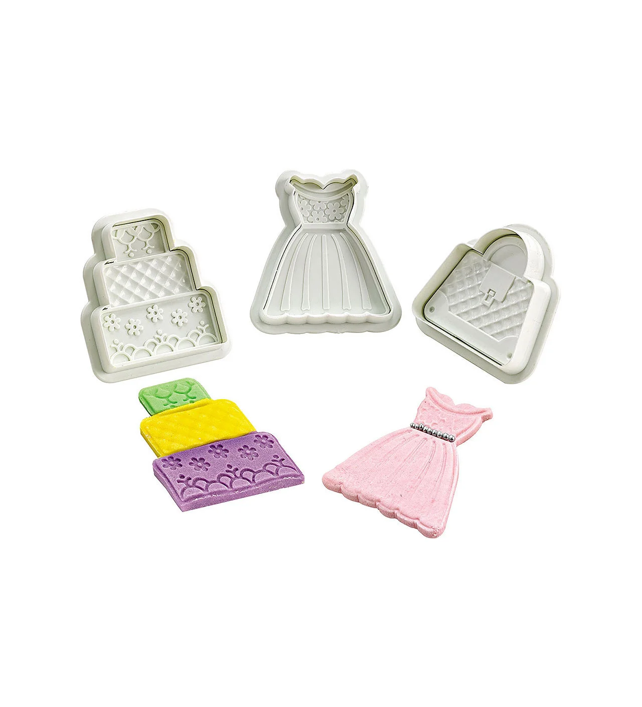 Les fans de mode ne peuvent pas passer à côté de ce must-have pâtissier : le kit d'emporte pièce spécial mode ! Celui-ci se compose d'un emporte pièce gâteau à étages, d'un autre représentant une robe et d'un dernier en forme de sac à main. Cadenas et matelassage sur le sac, plis et ceinture sur la robe, damier et fleur sur le gâteau : vous serez séduits par la richesse et la précision des détails présents sur les emporte pièce.