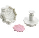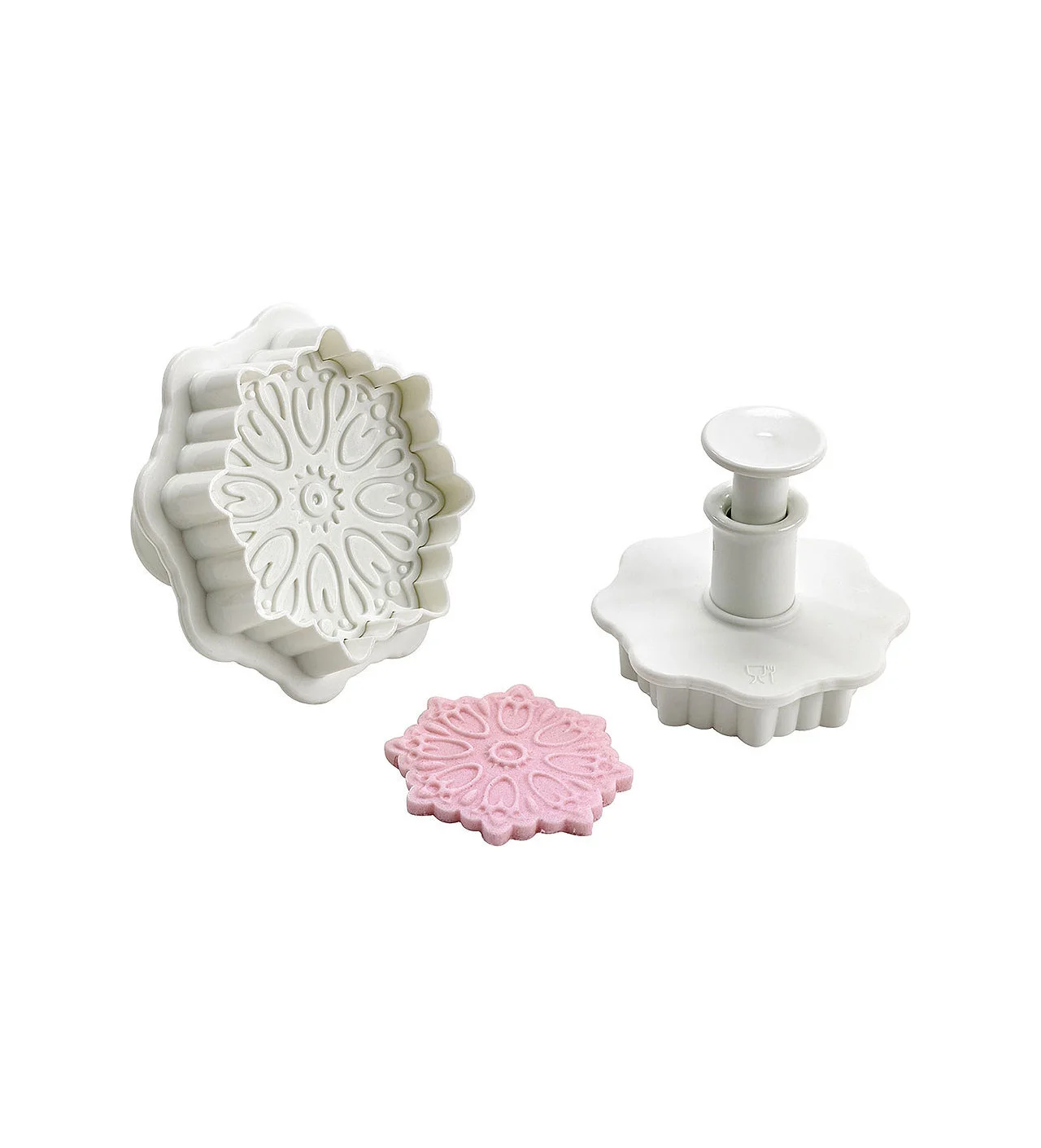 Ce kit se compose de deux emporte pièce de 45 et 60 mm de diamètre. Dotés d'un poussoir, ce dernier permet d'imprimer le motif et d'éjecter la pâte en une manipulation. Pour un décor réussi, veillez à bien abaisser la pâte à sucre avant de presser l'emporte pièce et d'appuyer sur le poussoir. Pour que la pâte à sucre ne colle pas, mieux vaut travailler avec des ustensiles de pâtisserie en silicone (tapis et rouleau à pâtisserie).