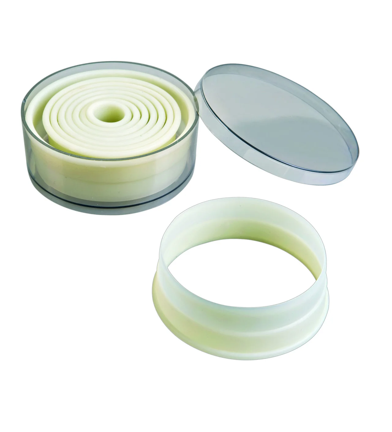 Les emporte pièce ronds unis sont déclinés sous 9 diamètres différents. Présentés dans une boîte transparente, ils se rangent facilement et prennent très peu de place. Si les professionnels des métiers de bouche choisissent ces emporte pièce, ce n'est pas pour rien. Fabriqués d'un seul bloc, ils sont bien plus faciles à nettoyer et répondent pleinement aux normes d'hygiène alimentaire. Les emporte pièce sont faits de polyglass, un matériau qui résiste à la chaleur jusqu'à 200°C.