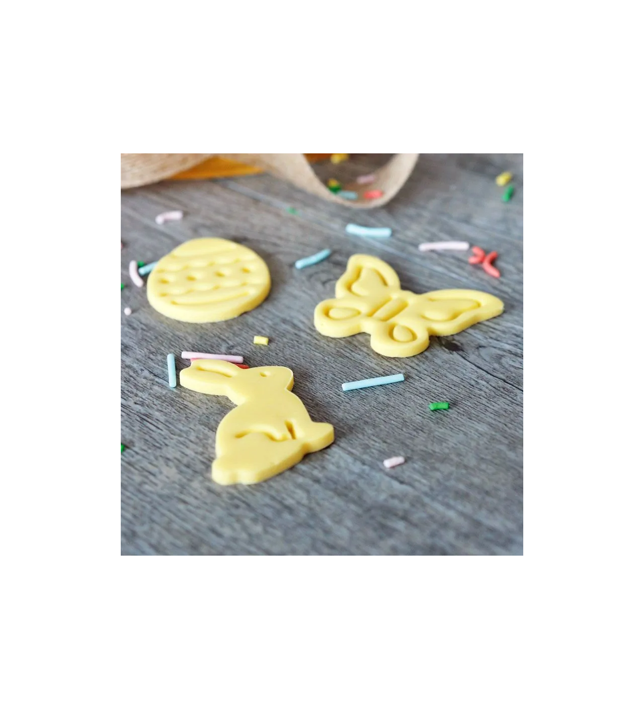 Retrouvez 4 emporte-pièces différents pour varier les plaisirs, un œuf, un lapin, un poussin et un papillon. De quoi composer un adorable assortiment printanier qui fera fondre petits et grands.