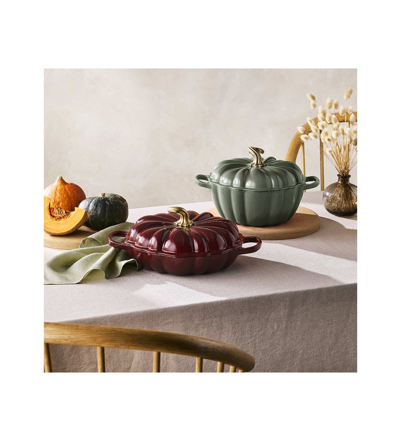 Côté visuel, le faitout citrouille est original et saura séduire les amateurs de l’automne. Sa couleur rouge garnet réchauffera les cœurs et est sublimée par la touche dorée de la poignée. L’ensemble forme un faitout rond de 28 cm qui se démarquera dans votre cuisine et sur la table du repas.