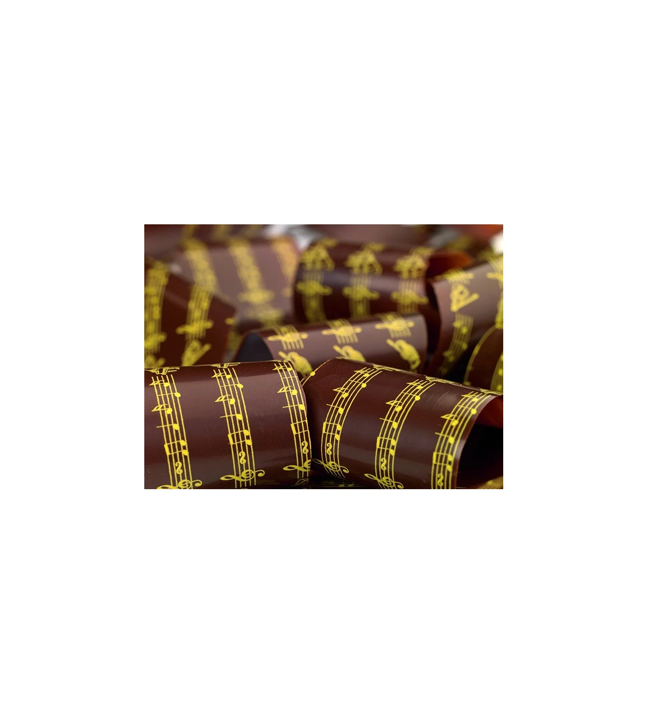La musique et la chocolaterie s’allient en une création délicieuse grâce aux feuilles de transfert Mallard. C’est un véritable mélange des arts culinaires et musicaux que Mallard vous propose avec le papier de transfert chocolat musique jaune.