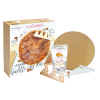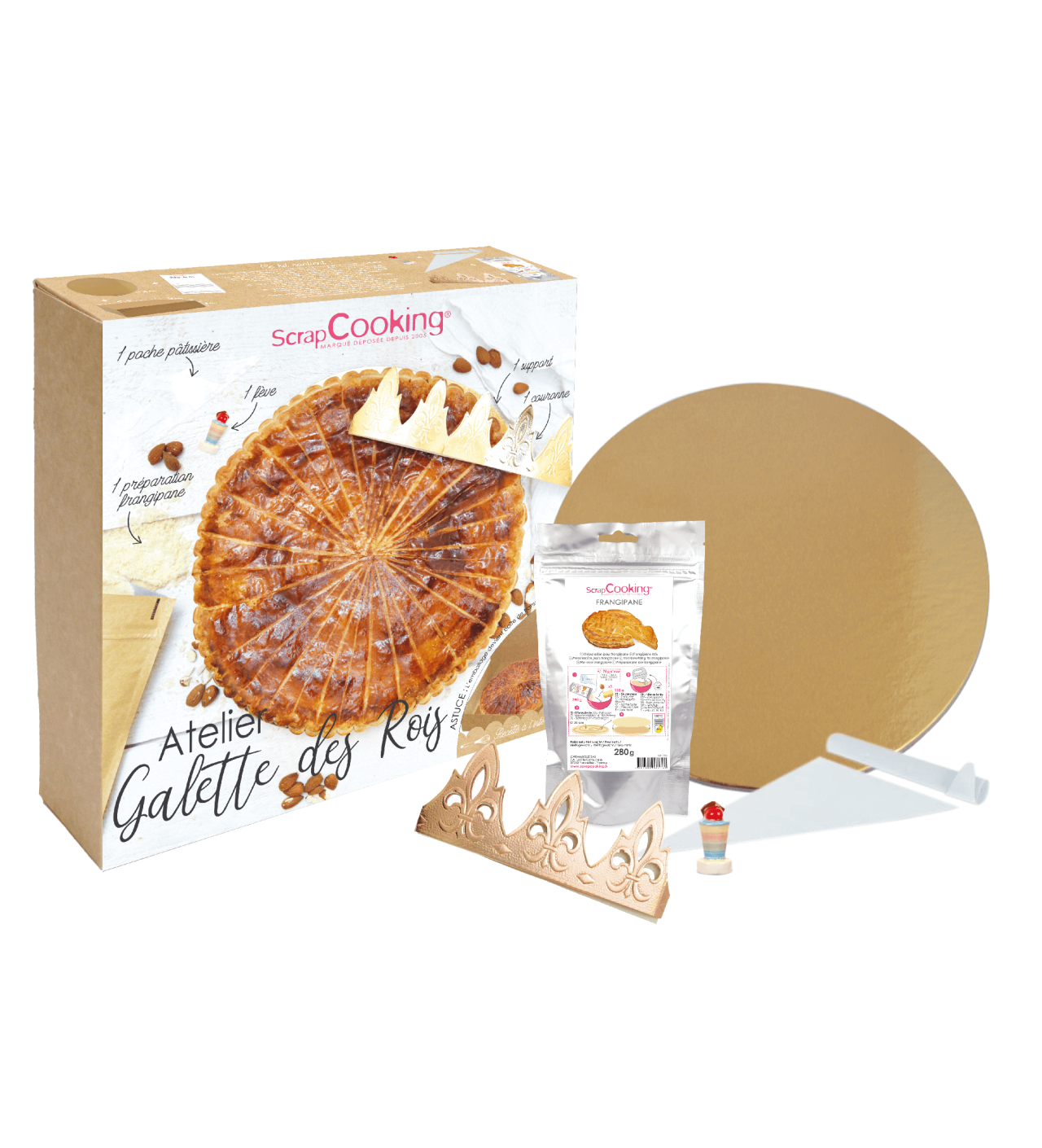 Ce coffret livré avec une recette galette des rois, vous indiquera étape par étape la marche à suivre pour une recette réussie. À l’intérieur de ce coffret vous trouverez, une préparation frangipane de 280g, une poche à douille jetable en plastique PEBD, ainsi qu’un support gâteau cartonné doré de 30 cm de diamètre.