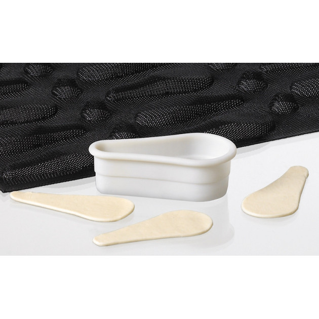 Découpoir en forme de Cuillère spécialement conçu pour la découpe de fonds de pâtes à cuire dans les moules Flexipan Cuillère et Silform Cuillère. Une fois cuites, ces cuillères consommables peuvent être garnies.
