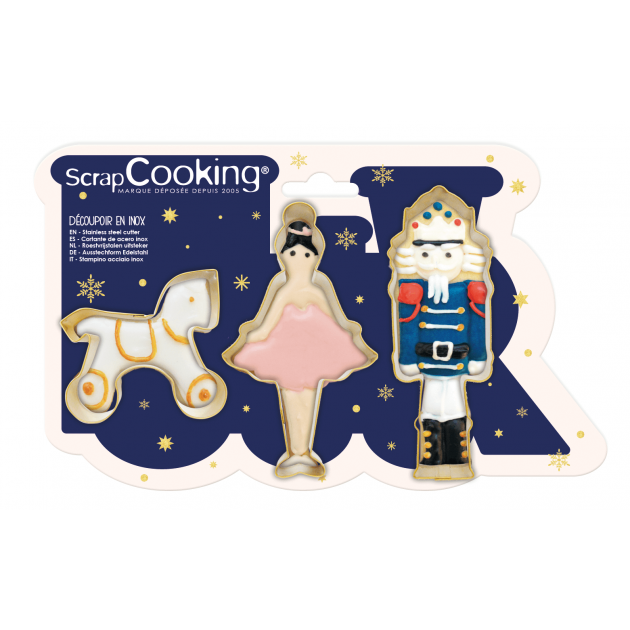 Créer des biscuits originaux sera un jeu d’enfant grâce au lot d’emporte-pièces Scrapcooking. Composé d’inox, les 3 découpoirs de ce lot prennent la forme d’un casse-noisette, d’une danseuse et d’un cheval. Ces designs sont inspirés du célèbre ballet Casse-noisette et vous permettront de confectionner des biscuits sur le thème de ce conte enchanteur.